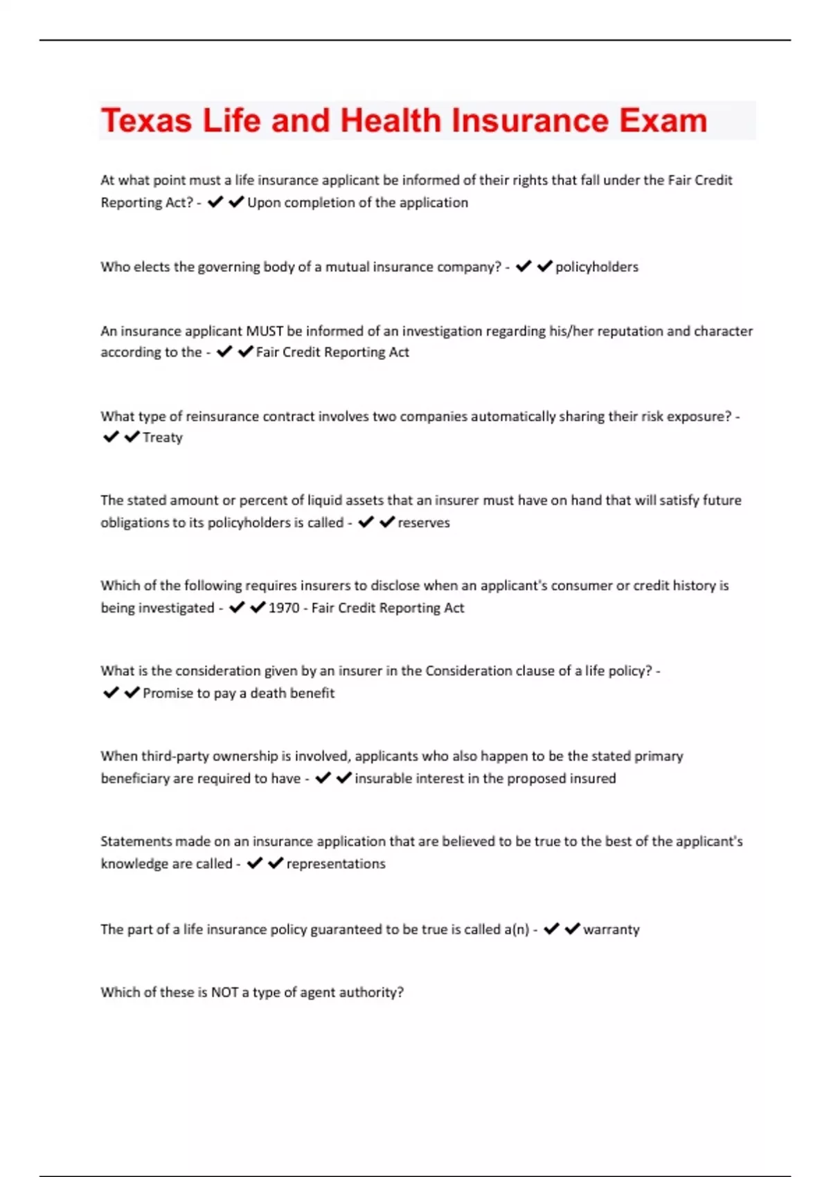 At what point must a life insurance applicant be informed of their rights that fall under the Fair Credit Reporting Act? - Upon completion of the application Who elects the governing body of a mutual insurance company? - policyholders An insurance applicant MUST be informed of an investigation regarding his/her reputation and character according to the - Fair Credit Reporting Act What type of reinsurance contract involves two companies automatically sharing their risk exposure? - Treaty The stated amount or percent of liquid assets that an insurer must have on hand that will satisfy future obligations to its policyholders is called - reserves Which of the following requires insurers to disclose when an applicant's consumer or credit history is being investigated - 1970 - Fair Credit Reporting Act What is the consideration given by an insurer in the Consideration clause of a life policy? - Promise to pay a death benefit When third-party ownership is involved, applicants who also happen to be the stated primary beneficiary are required to have - insurable interest in the proposed insured Statements made on an insurance application that are believed to be true to the best of the applicant's knowledge are called - representations The part of a life insurance policy guaranteed to be true is called a(n) - warranty Which of these is NOT a type of agent authority?Express Implied Principal Apparent - Principal The Consideration clause of an insurance contract includes - the schedule and amount of premium payments E and F are business partners. Each takes out a $500,000 life insurance policy on the other, naming himself as primary beneficiary. E and F eventually terminate their business, and four months later E dies. Although E was married with three children at the time of death, the primary beneficiary is still F. However, an insurable interest no longer exists. Where will the proceeds from E's life insurance policy be directed to? - In this situation, the proceeds from E's life insurance policy will go to F. Which of the following terms defines the legally enforceable promise in an insurance contract by the insurer? - Unilateral When must insurable interest exist for a life insurance contract to be valid? - Inception of the contract Insurance contracts are known as ____ because certain future conditions or acts must occur before any claims can be p