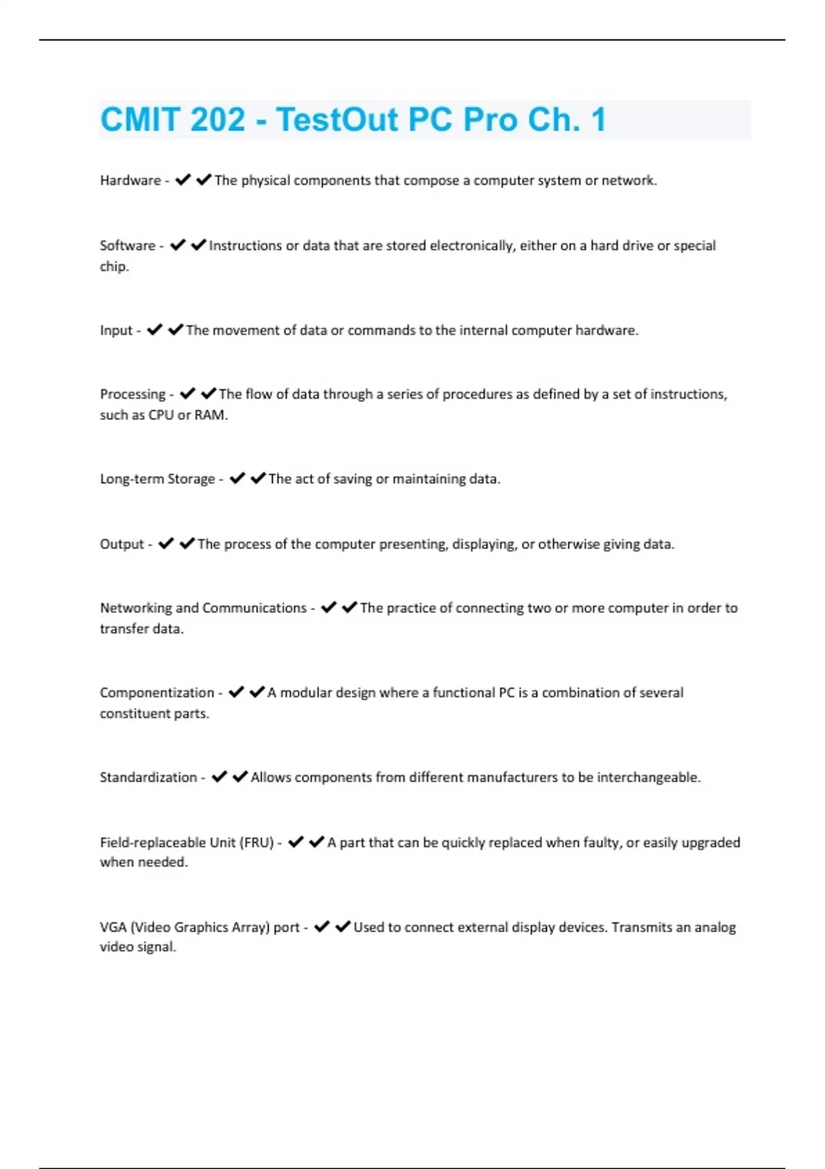 Hardware - The physical components that compose a computer system or network. Software - Instructions or data that are stored electronically, either on a hard drive or special chip. Input - The movement of data or commands to the internal computer hardware. Processing - The flow of data through a series of procedures as defined by a set of instructions, such as CPU or RAM. Long-term Storage - The act of saving or maintaining data. Output - The process of the computer presenting, displaying, or otherwise giving data. Networking and Communications - The practice of connecting two or more computer in order to transfer data. Componentization - A modular design where a functional PC is a combination of several constituent parts. Standardization - Allows components from different manufacturers to be interchangeable. Field-replaceable Unit (FRU) - A part that can be quickly replaced when faulty, or easily upgraded when needed. VGA (Video Graphics Array) port - Used to connect external display devices. Transmits an analog video signal.DVI (Digital Visual Interface) port - Used to connect display devices. Supports single or dual link. HDMI (High Definition Multimedia Interface) port - Used to send high-quality digital video and audio signals. Used by LCD monitors and HDTVs. Thunderbolt port - Combines PCI Express (PCIe) and DisplayPort signals into a single interface. Can also provide DC power. S-Video (Separated Video) port - Used for connecting external displays. Slightly better picture quality than RCA video ports. USB Type-A - One of the most common computer ports, used to connect a variety of devices. IEEE 1394 port (Firewire) - Used to connect devices that require fast communication speeds, such as external hard drives and video cameras. Considered obsolete with rise in popularity of USB. Audio Jack - Used to send or receive analog audio signals. Uses 3.5 mm TRS connectors to connect devices. S/PDIF port - Used to send a digital audio signal to high-end audio devices, such as home theater systems. RJ45 port - Used to create Ethernet networks by connecting multiple computers and network devices. Has eight connector pins. RJ11 port - Used by telephones and modems to send analog signals. Has four connector pins. Operating system - A set of programs that acts as an interface between the applications that are running on a computer and the computers hardware.