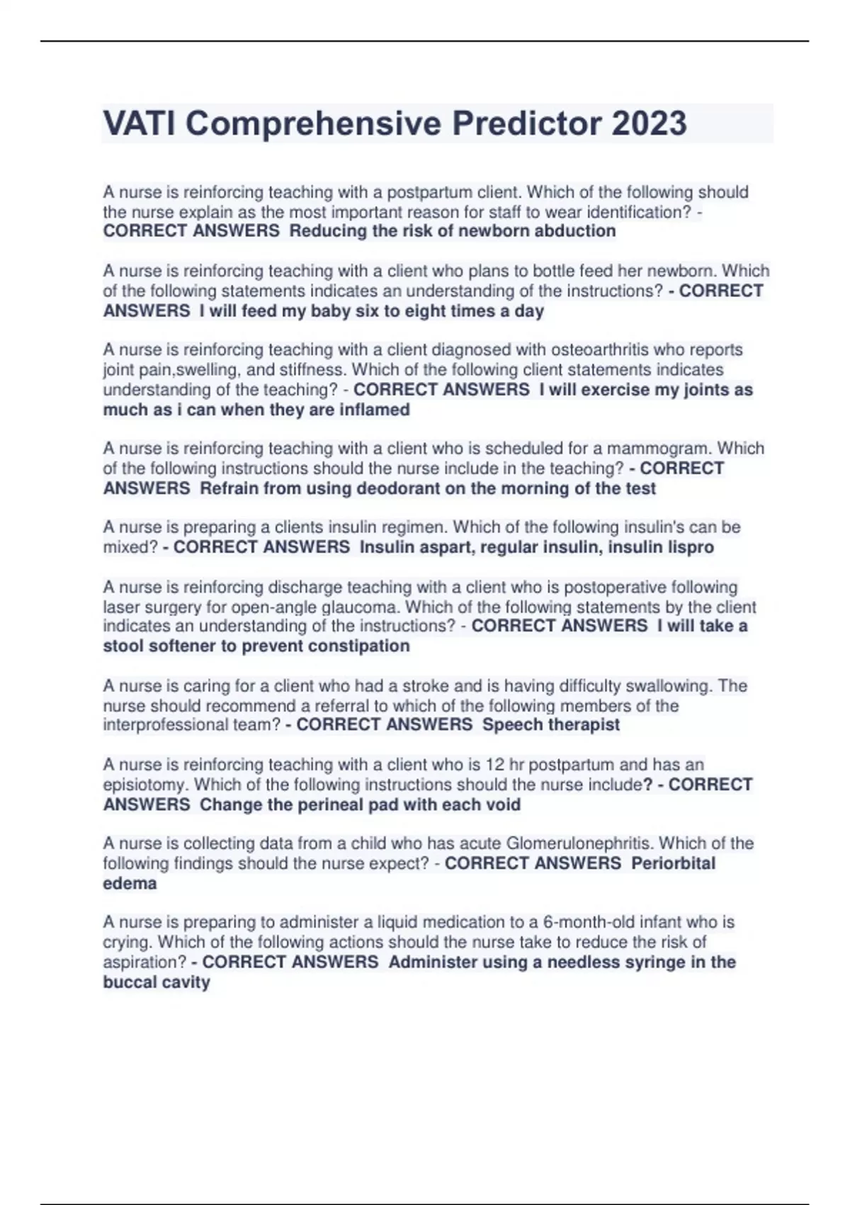 VATI Comprehensive Predictor 2023 A nurse is reinforcing teaching with a postpartum client. Which of the following should the nurse explain as the most important reason for staff to wear identification? - CORRECT ANSWERS Reducing the risk of newborn abduction A nurse is reinforcing teaching with a client who plans to bottle feed her newborn. Which of the following statements indicates an understanding of the instructions? - CORRECT ANSWERS I will feed my baby six to eight times a day A nurse is reinforcing teaching with a client diagnosed with osteoarthritis who reports joint pain,swelling, and stiffness. Which of the following client statements indicates understanding of the teaching? - CORRECT ANSWERS I will exercise my joints as much as i can when they are inflamed A nurse is reinforcing teaching with a client who is scheduled for a mammogram. Which of the following instructions should the nurse include in the teaching? - CORRECT ANSWERS Refrain from using deodorant on the morning of the test A nurse is preparing a clients insulin regimen. Which of the following insulin's can be mixed? - CORRECT ANSWERS Insulin aspart, regular insulin, insulin lispro A nurse is reinforcing discharge teaching with a client who is postoperative following laser surgery for open-angle glaucoma. Which of the following statements by the client indicates an understanding of the instructions? - CORRECT ANSWERS I will take a stool softener to prevent constipation A nurse is caring for a client who had a stroke and is having difficulty swallowing. The nurse should recommend a referral to which of the following members of the interprofessional team? - CORRECT ANSWERS Speech therapist A nurse is reinforcing teaching with a client who is 12 hr postpartum and has an episiotomy. Which of the following instructions should the nurse include? - CORRECT ANSWERS Change the perineal pad with each void A nurse is collecting data from a child who has acute Glomerulonephritis. Which of the following findings should the nurse expect? - CORRECT ANSWERS Periorbital edema A nurse is preparing to administer a liquid medication to a 6-month-old infant who is crying. Which of the following actions should the nurse take to reduce the risk of aspiration? - CORRECT ANSWERS Administer using a needless syringe in the buccal cavity A nurse is reinforcing teaching with a client who has peptic ulcer disease. Which of the following statements by the client indicates an understanding of the teaching? - CORRECT ANSWERS I will plan to have my meals at regular intervals A nurse in long-term care facility has received change-of-shift report about four clients. Which of the following clients should the nurse attend to first? - CORRECT ANSWERS A client who has COPD and dementia and was agitated during the night shift A nurse is collecting data from a client who has substance use disorder and reports recently taking opioids. Which of the following findings should the nurse identify as a manifestation of opioid intoxication? - CORRECT ANSWERS Pinpoint pupils A nurse in a urgent care clinic is collecting data from a client who reports having diarrhea for the past 3 days. Which of the following findings indicates hypokalemia? - CORRECT ANSWERS Muscle weakness A nurse is contributing to the discharge plans for four clients. The nurse should identify that which of the following clients requires an interdisciplinary care conference? - CORRECT ANSWERS A client who has hemiparesis and lives alone A nurse is reinforcing teaching with an adolescent who has a new prescription for cefazolin. For which of the following findings should the nurse instruct the adolescent to monitor and report to the provider? - CORRECT ANSWERS Depression A nurse is reinforcing teaching with a group of expectant parents regarding the proper use of a car seat. Which of the following statements by a parent indicates an understanding of the teaching? - CORRECT ANSWERS I can place a rolled towel on each side of my newborns head until he can hold his head up A nurse is caring for a school-age child who has epistaxis. Which of them following actions should the nurse take? - CORRECT ANSWERS Apply pressure at the bridge of the child's nose A nurse is caring for four clients. Which of the following clients statements should the nurse attend to first? - CORRECT ANSWERS My heartburn pain is going into my jaw now A nurse in a providers office is talking on the phone with the parent of a school-age child who has varicella. - CORRECT ANSWERS All vesicles have crusted over A nurse is collecting data from a client who hgb is 8.8 mg/dL. Which of the following statements should the nurse expect? - CORRECT ANSWERS I feel tired all the time A nurse is administering a cleansing enema to a client who reports mild cramping during instillation of the solution. Which of the following actions should the nurse take? - CORRECT ANSWERS Slow the rate of instillation A nurse receives report on four clients. The nurse should