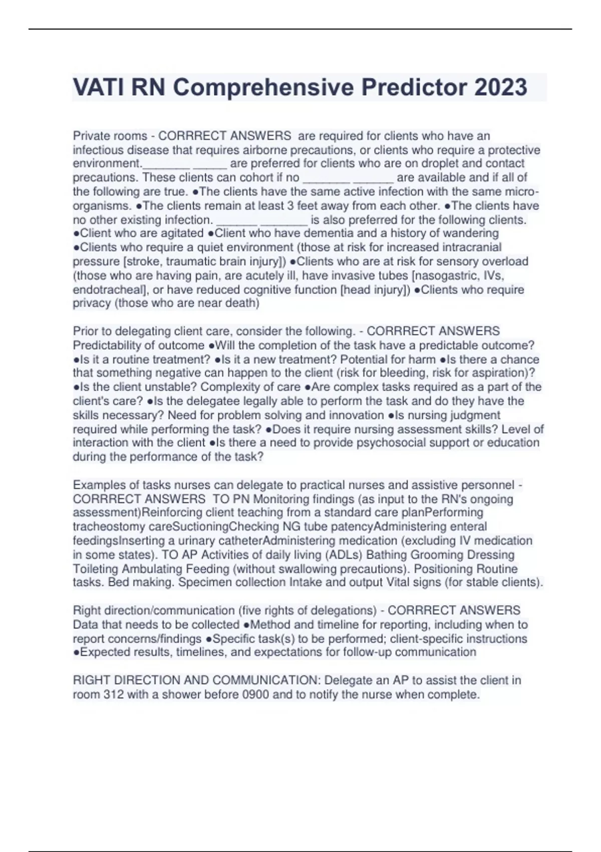 VATI RN Comprehensive Predictor 2023 Private rooms - CORRRECT ANSWERS are required for clients who have an infectious disease that requires airborne precautions, or clients who require a protective environment._______ _____ are preferred for clients who are on droplet and contact precautions. These clients can cohort if no _______ ______ are available and if all of the following are true. ●The clients have the same active infection with the same microorganisms. ●The clients remain at least 3 feet away from each other. ●The clients have no other existing infection. ______ _______ is also preferred for the following clients. ●Client who are agitated ●Client who have dementia and a history of wandering ●Clients who require a quiet environment (those at risk for increased intracranial pressure [stroke, traumatic brain injury]) ●Clients who are at risk for sensory overload (those who are having pain, are acutely ill, have invasive tubes [nasogastric, IVs, endotracheal], or have reduced cognitive function [head injury]) ●Clients who require privacy (those who are near death) Prior to delegating client care, consider the following. - CORRRECT ANSWERS Predictability of outcome ●Will the completion of the task have a predictable outcome? ●Is it a routine treatment? ●Is it a new treatment? Potential for harm ●Is there a chance that something negative can happen to the client (risk for bleeding, risk for aspiration)? ●Is the client unstable? Complexity of care ●Are complex tasks required as a part of the client's care? ●Is the delegatee legally able to perform the task and do they have the skills necessary? Need for problem solving and innovation ●Is nursing judgment required while performing the task? ●Does it require nursing assessment skills? Level of interaction with the client ●Is there a need to provide psychosocial support or education during the performance of the task? Examples of tasks nurses can delegate to practical nurses and assistive personnel - CORRRECT ANSWERS TO PN Monitoring findings (as input to the RN's ongoing assessment)Reinforcing client teaching from a standard care planPerforming tracheostomy careSuctioningChecking NG tube patencyAdministering enteral feedingsInserting a urinary catheterAdministering medication (excluding IV medication in some states). TO AP Activities of daily living (ADLs) Bathing Grooming Dressing Toileting Ambulating Feeding (without swallowing precautions). Positioning Routine tasks. Bed making. Specimen collection Intake and output Vital signs (for stable clients). Right direction/communication (five rights of delegations) - CORRRECT ANSWERS Data that needs to be collected ●Method and timeline for reporting, including when to report concerns/findings ●Specific task(s) to be performed; client-specific instructions ●Expected results, timelines, and expectations for follow-up communication RIGHT DIRECTION AND COMMUNICATION: Delegate an AP to assist the client in room 312 with a shower before 0900 and to notify the nurse when complete. WRONG DIRECTION AND COMMUNICATION: Delegate an AP to assist the client in room 312 with morning hygiene. Steps in providing educational programs - CORRRECT ANSWERS 1. Identify and respond: Determine the need for knowledge or skill proficiency 2. Analyze: Look for deficiencies, and develop learning objectives to meet the need 3. Research: Resources available to address learning objectives based on evidence-based practice 4. Plan: Program to address objectives using available resources 5. Implement: Program(s) at a time conducive to staff availability; consider online learning modules 6. Evaluate: Use materials and observations to measure behavior changes secondary to learning objectives Tetralogy of Fallot. - CORRRECT ANSWERS Four defects that result in mixed blood flow: Pulmonary stenosis, ventricular septal defect, overriding aorta, right ventricular hypertrophy. Cyanosis at birth: progressive cyanosis over the first year of life. Systolic murmur. Episodes of acute cyanosis and hypoxia (blue or "Tet" spells knee chest position or squating). SURGICAL PROCEDURES Shunt placement until able to undergo primary repair. Complete repair within the first year of life. Defects that increase pulmonary blood flow - CORRRECT ANSWERS Ventricular septal defect (VSD) (20.1) Atrial septal defect (ASD), Patent ductus arteriosus (PDA), Defects that increase pulmonary blood flow Ventricular septal defect (VSD) - CORRRECT ANSWERS _______ A hole in the septum between the right and left ventricle that results in increased pulmonary blood flow (left-to-right shunt) ●Loud, harsh murmur auscultated at the left sternal border ●Heart failure ●Many VSDs close spontaneously early in life. Defects that increase pulmonary blood flow Atrial septal defect (ASD) - CORRRECT ANSWERS A hole in the septum between the right and left atria that results in increased pulmonary blood flow (left-to-right shunt) ●Loud, harsh murmur with a fixed split second heart sound ●Heart failure ●Asymptomatic (possibly) Defects that increase pulmonary blood flow Patent ductus arteriosus (PDA) - CORRRECT ANSWERS A condition in which the normal fetal circulation conduit between the pulmonary artery and the aorta fails to close and results in increased pulmonary blood flow (left-to-right shunt) ●Systolic murmur (machine hum) ●Wide pulse pressure ●Bounding pulses ●Asymptomatic (possibly) ●Heart failure ●Rales Obstructive defects - CORRRECT ANSWERS include those where blood flow exiting the heart meets an area of narrowing (stenosis), which causes obstruction of blood flow. ●The pressure that occurs before the defect is increased (ventricle) and the pressure that occurs after the defect is decreased. This results in a decrease in cardiac output. ●These children can present with manifestations of heart failure. Pulmonary stenosis (20.2), Aortic stenosis, Coarctation of the aorta (20.3) Pulmonary stenosis (20.2) - CO