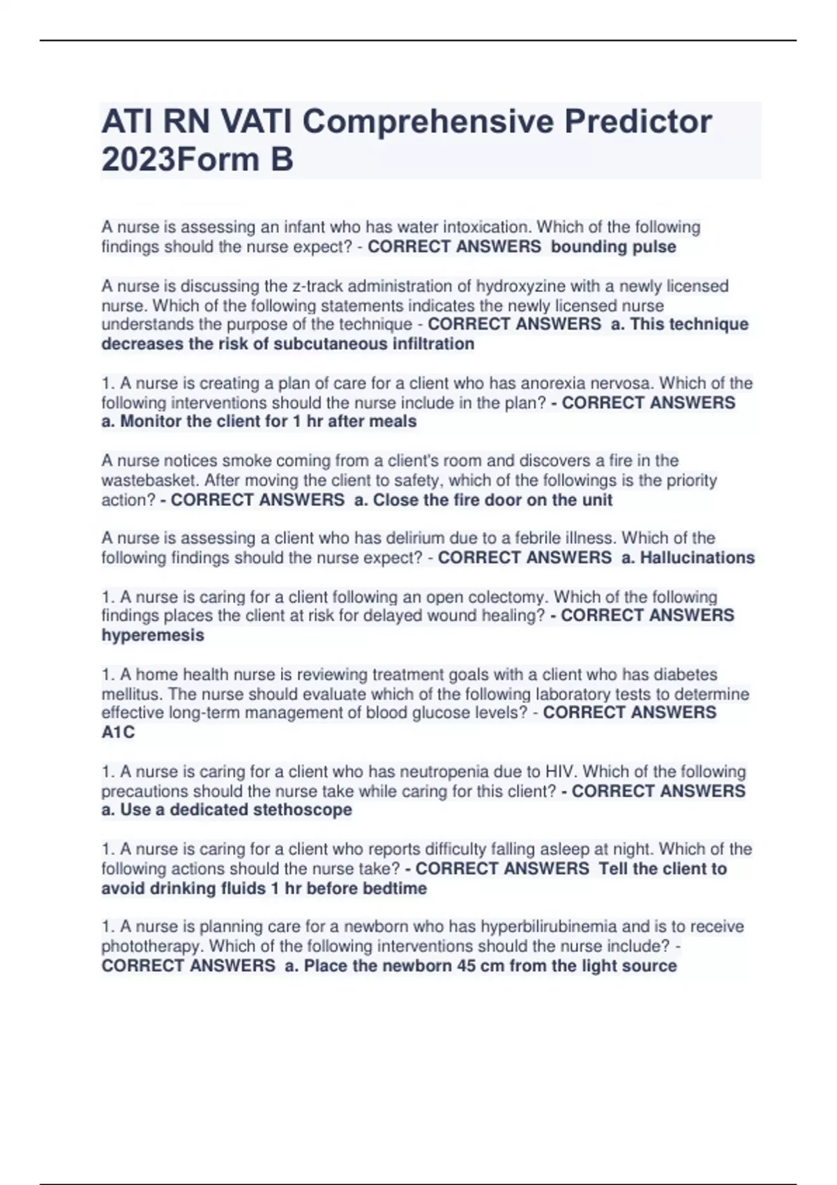 ATI RN VATI Comprehensive Predictor 2023Form B A nurse is assessing an infant who has water intoxication. Which of the following findings should the nurse expect? - CORRECT ANSWERS bounding pulse A nurse is discussing the z-track administration of hydroxyzine with a newly licensed nurse. Which of the following statements indicates the newly licensed nurse understands the purpose of the technique - CORRECT ANSWERS a. This technique decreases the risk of subcutaneous infiltration 1. A nurse is creating a plan of care for a client who has anorexia nervosa. Which of the following interventions should the nurse include in the plan? - CORRECT ANSWERS a. Monitor the client for 1 hr after meals A nurse notices smoke coming from a client's room and discovers a fire in the wastebasket. After moving the client to safety, which of the followings is the priority action? - CORRECT ANSWERS a. Close the fire door on the unit A nurse is assessing a client who has delirium due to a febrile illness. Which of the following findings should the nurse expect? - CORRECT ANSWERS a. Hallucinations 1. A nurse is caring for a client following an open colectomy. Which of the following findings places the client at risk for delayed wound healing? - CORRECT ANSWERS hyperemesis 1. A home health nurse is reviewing treatment goals with a client who has diabetes mellitus. The nurse should evaluate which of the following laboratory tests to determine effective long-term management of blood glucose levels? - CORRECT ANSWERS A1C 1. A nurse is caring for a client who has neutropenia due to HIV. Which of the following precautions should the nurse take while caring for this client? - CORRECT ANSWERS a. Use a dedicated stethoscope 1. A nurse is caring for a client who reports difficulty falling asleep at night. Which of the following actions should the nurse take? - CORRECT ANSWERS Tell the client to avoid drinking fluids 1 hr before bedtime 1. A nurse is planning care for a newborn who has hyperbilirubinemia and is to receive phototherapy. Which of the following interventions should the nurse include? - CORRECT ANSWERS a. Place the newborn 45 cm from the light source 1. A nurse is planning care for a client who has schizophrenia and is having difficulty expressing their feelings. Which of the following referrals should the nurse make? - CORRECT ANSWERS social worker 1. A nurse is caring for a client who has heart failure and has started taking a loop diuretic. Which of the following findings indicates the client is experiencing an adverse effect of the medication - CORRECT ANSWERS decreased reflexes 1. At the start of an evening shift on a cardiac unit, a licensed practical nurse brings the nurse a list of client reports. Which of the following client reports should the nurse assess first? - CORRECT ANSWERS indigestion 1. A nurse is caring for a client who has just returned to the unit following a bronchoscopy. Which of the following actions by the assistive personnel requires the nurse to intervene? - CORRECT ANSWERS offer oral fluids to the client 1. A nurse on a medical unit has just received change-of-shift report. Which of the following clients should the nurse assess first? - CORRECT ANSWERS a. A 68 year old client who had a myocardial infarction 2 days ago and reports chest pain as a 4 on a scale of 0 to 10 1. A nurse is assessing a client prior to performing a blood draw. The nurse should identify that an allergy to which of the following food can indicate that the client has an allergy to latex? - CORRECT ANSWERS avocados 1. A nurse is preparing to witness a client's signature on an informed consent for a total knee arthroplasty. Which of the following client statements indicates the nurse should contact the surgeon? - CORRECT ANSWERS a. I am thankful there are no serious complications from this type of surgery 1. A nurse is admitting a client who has antisocial personality disorder. Which of the following client behaviors should the nurse identify as consistent with this disorder? - CORRECT ANSWERS a. Uses others for personal gain 1. A nurse is teaching the parent of a school-age child who has scabies about the application of permethrin 5% cream. The nurse should include which of the following as a potential adverse effect of the medication? - CORRECT ANSWERS burning 1. A nurse is teaching a client who has a new prescription for digoxin. Which of the following statements should the nurse include in the teaching? - CORRECT ANSWERS muscle weakness 1. A nurse is planning teaching for a client who is at 10 weeks of gestation and has a history of urinary tract infections. Which of the following information should the nurse plan to include in the teaching about UTI prevention? - CORRECT ANSWERS a. Empty the bladder before and after intercourse 1. A nurse is providing discharge teaching to a client who is postpartum and plans to breastfeed. Which of the following should the nurse recommend the client increase in their diet during lactation? - CORRECT ANSWERS a. Calc