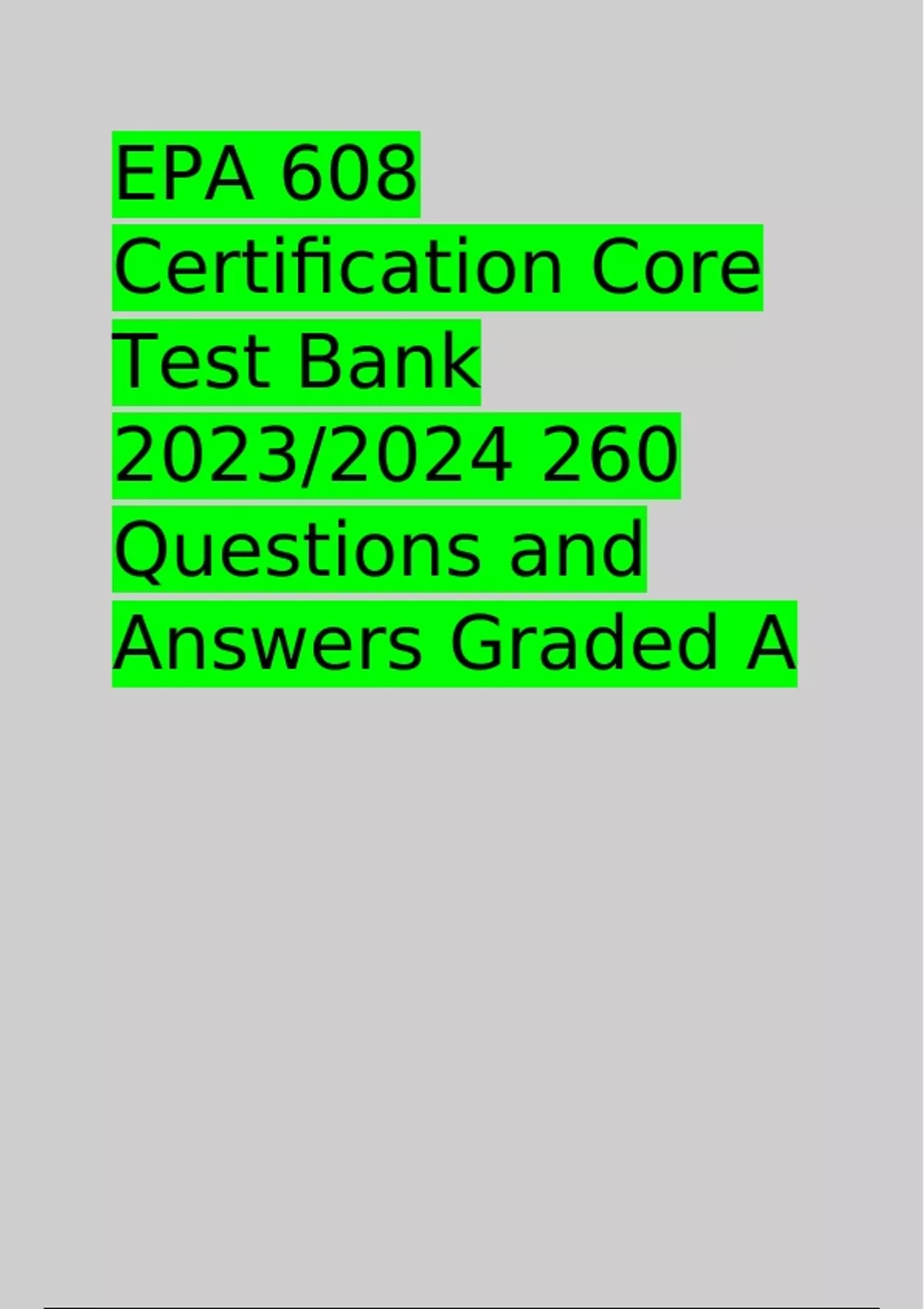 EPA 608 Certification Core Test Bank 2023/2024 260 Questions and Answers Graded A EPA 608 CERTIFICATION Halons were completely phased out by ______ : 1994 1995 1987 2000 - √Answer :1994 Quiz :Recovered refrigerant is stored in which of the following painted tank: Gray with yellow top Yellow with gray top Yellow with blue top Blue with yellow top - √Answer :Gray with yellow top Quiz :If your recovery unit does not have a sub-cooling feature recovery rate will be _____ : Recovery rate is independent Slower Faster - √Answer :Slower Quiz :TXV valve maintaining the pressure difference between _____ and _____ of the system Expansion valve, Evaporator Condenser, Evaporator Compressor, Condenser Evaporator, Compressor - √Answer :Condenser, Evaporator Quiz :After recovering refrigerant from a sealed system, which of the following gas is used to pressurize (for leak checking) or blow debris out of the system: Hydrogen Carbon dioxide Oxygen Nitrogen gas - √Answer :Nitrogen gas Quiz :Which one of the following has highest Ozone Depletion Potential (ODP): HCFC All will have same ODP CFC HFC - √Answer :CFC Quiz :The ____connects the evaporator to the compressor in a refrigerant system: Suction Line Evaporation Line Discharge Line Liquid Line - √Answer :Suction Line Quiz :A violation of the Clean Air Act, including improper record keeping, is subject to a penalty of a fine of up to _____ per day per violation: $37,500 $40,000 $24,000 $35,000 - √Answer :$37,500 Quiz :At which of the following stage in refrigeration cycle does the refrigerant changes from high-pressure vapor to a high-pressure liquid: Evaporator Condenser Compressor Expansion valve - √Answer :Condenser Quiz :Which of the following is not most effective way to detect the general area of a small leaks: fluorescent Indicator Ultrasonic tester All the options are correct Electronic tester - √Answer :fluorescent Indicator Quiz :During each vacuum decay test, it is observed that after creating the vacuum, the pressure of the system increases to greater than 0 psig and stops at some point, Then: Leak could not be observed Leak is observed but not refrigerant is trapped None of the answers are correct The refrigerant could be trapped in the system - √Answer :The refrigerant could be trapped in the system