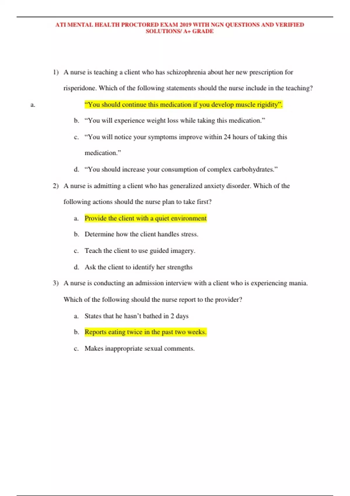 ATI MENTAL HEALTH PROCTORED EXAM 2019 WITH NGN QUESTIONS AND VERIFIED SOLUTIONS A+ GRADE