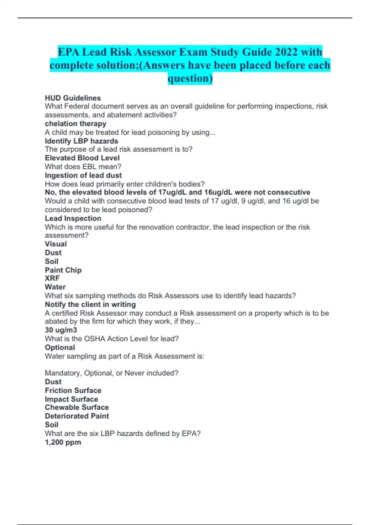EPA Lead Risk Assessor Exam Study Guide 2022 with complete solution;(Answers have been placed before each question) HUD Guidelines What Federal document serves as an overall guideline for performing inspections, risk assessments, and abatement activities? chelation therapy A child may be treated for lead poisoning by using... Identify LBP hazards The purpose of a lead risk assessment is to? Elevated Blood Level What does EBL mean? Ingestion of lead dust How does lead primarily enter children's bodies? No, the elevated blood levels of 17ug/dL and 16ug/dL were not consecutive Would a child with consecutive blood lead tests of 17 ug/dl, 9 ug/dl, and 16 ug/dl be considered to be lead poisoned? Lead Inspection Which is more useful for the renovation contractor, the lead inspection or the risk assessment? Visual Dust Soil Paint Chip XRF Water What six sampling methods do Risk Assessors use to identify lead hazards? Notify the client in writing A certified Risk Assessor may conduct a Risk assessment on a property which is to be abated by the firm for which they work, if they... 30 ug/m3 What is the OSHA Action Level for lead? Optional Water sampling as part of a Risk Assessment is: Mandatory, Optional, or Never included? Dust Friction Surface Impact Surface Chewable Surface Deteriorated Paint Soil What are the six LBP hazards defined by EPA? 1,200 ppm EPA Soil lead hazard in general yard area True XRF analysis is the most common method for determining LBP False, XRF is most commonly used to determine LBP but not hazards XRF analysis is the most common method for determining lead hazards Performance Characteristic Sheet (PCS) supplied with the XRF Where would you find operational data for an XRF? 13 How many dust samples are usually taken for a Risk Assessment? Removal Enclosure Encapsulation What are the three forms of lead abatement? 3 shots on the 1.02 standard How do you calibrate an XRF? Beginning End Every 4 hours Every time the device is powered down How often do you calibrate an XRF? Equal to or greater than 1.0 mg/cm2 LBP per XRF Greater than 0.5% by weight LBP % level by paint chip analysis 40 ug/ft2 EPA Floor clearance/hazard level 250 ug/ft2 EPA Window sill or stool clearance/hazard level 400 ug/ft2 EPA Window trough or well clearance/hazard level 50 ug/m3 OSHA lead PEL 30 ug/m3 OSHA lead Action Level 400 ppm EPA Soil play area/vegetable garden clearance/hazard level 1,200 ppm EPA Soil other parts of yard clearance/hazard level 5,000 ppm HUD required Level for soil abatement greater than 15 ppb or 15ug/l or 0.015mg/l EPA action level criteria for lead in drinking water 5 ug/dL Lead blood Level requiring investigation in children A single LBL reading above 20 ug/dL or two consecutive readings between 15-19 ug/dL.