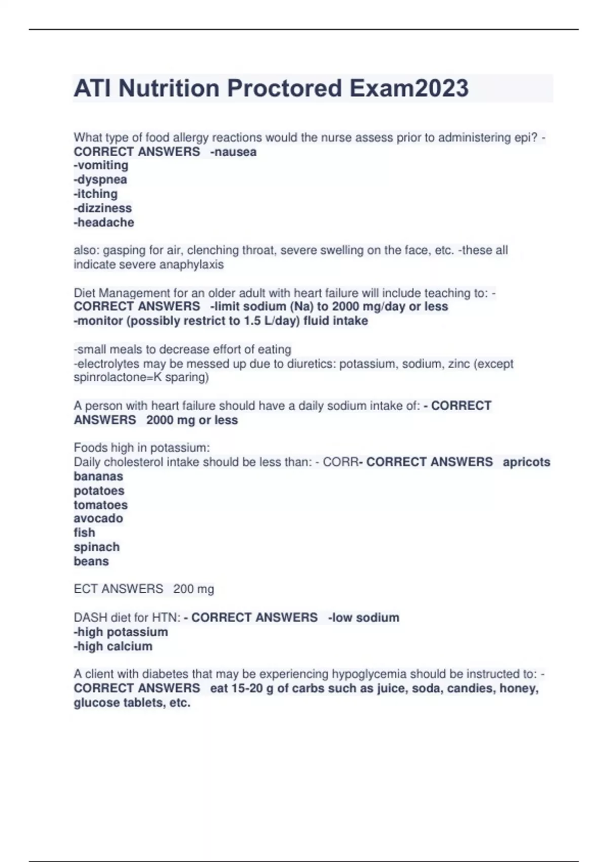 ATI Nutrition Proctored Exam2023 What type of food allergy reactions would the nurse assess prior to administering epi? - CORRECT ANSWERS -nausea -vomiting -dyspnea -itching -dizziness -headache also: gasping for air, clenching throat, severe swelling on the face, etc. -these all indicate severe anaphylaxis Diet Management for an older adult with heart failure will include teaching to: - CORRECT ANSWERS -limit sodium (Na) to 2000 mg/day or less -monitor (possibly restrict to 1.5 L/day) fluid intake -small meals to decrease effort of eating -electrolytes may be messed up due to diuretics: potassium, sodium, zinc (except spinrolactone=K sparing) A person with heart failure should have a daily sodium intake of: - CORRECT ANSWERS 2000 mg or less Foods high in potassium: Daily cholesterol intake should be less than: - CORR- CORRECT ANSWERS apricots bananas potatoes tomatoes avocado fish spinach beans ECT ANSWERS 200 mg DASH diet for HTN: - CORRECT ANSWERS -low sodium -high potassium -high calcium A client with diabetes that may be experiencing hypoglycemia should be instructed to: - CORRECT ANSWERS eat 15-20 g of carbs such as juice, soda, candies, honey, glucose tablets, etc. General nutritional guidelines for a client with diabetes: - CORRECT ANSWERS Carbs: 130 g/day from grains, fruits, legumes, milk. No simple carbs. Fats: sat fat less than 7% of total calories, trans fatty acid less than 1% of total daily caloric intake, limit fried foods. Cholesterol: 200-300 mg/day Fiber: 14 g per 1000 calories from beans, oats, veggies, whole grains Protein: 15-20% total caloric intake from meats, eggs, fish, nuts, beans, & soy products NO TOBACCO, LIMIT ALCOHO