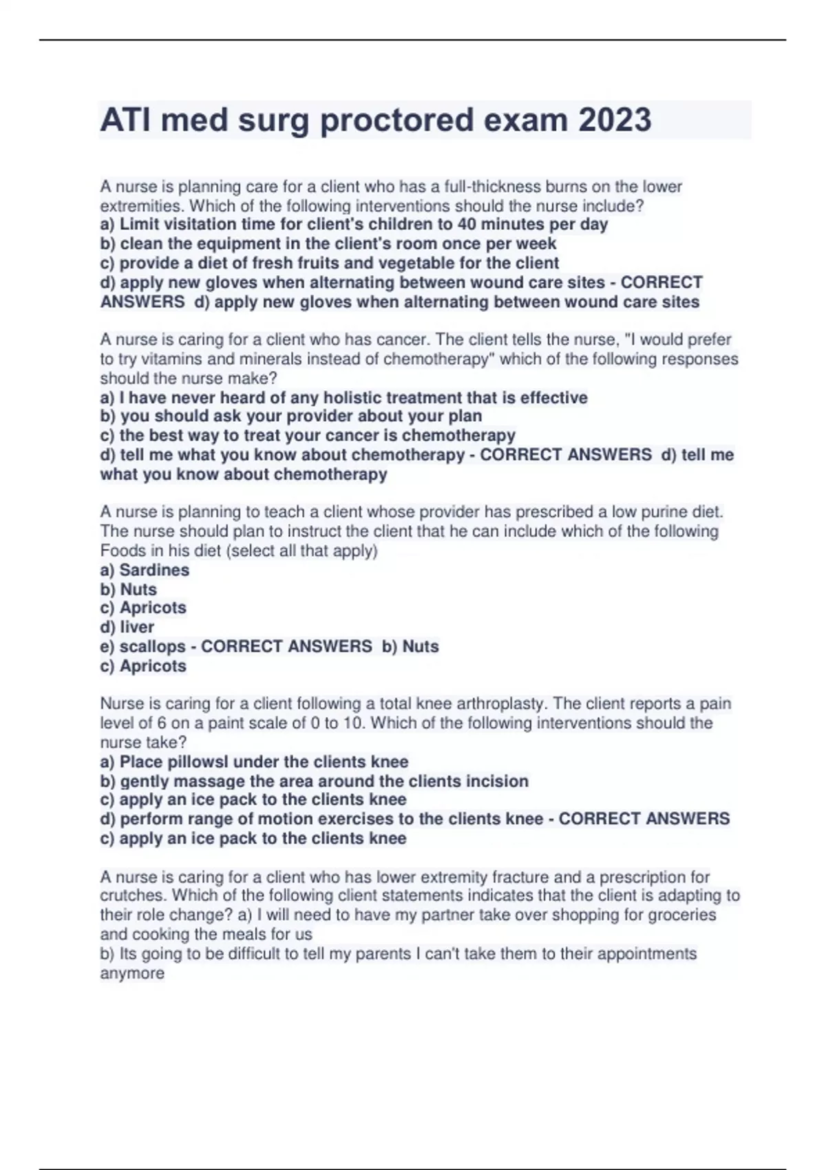 ATI med surg proctored exam 2023 A nurse is planning care for a client who has a full-thickness burns on the lower extremities. Which of the following interventions should the nurse include? a) Limit visitation time for client's children to 40 minutes per day b) clean the equipment in the client's room once per week c) provide a diet of fresh fruits and vegetable for the client d) apply new gloves when alternating between wound care sites - CORRECT ANSWERS d) apply new gloves when alternating between wound care sites A nurse is caring for a client who has cancer. The client tells the nurse, "I would prefer to try vitamins and minerals instead of chemotherapy" which of the following responses should the nurse make? a) I have never heard of any holistic treatment that is effective b) you should ask your provider about your plan c) the best way to treat your cancer is chemotherapy d) tell me what you know about chemotherapy - CORRECT ANSWERS d) tell me what you know about chemotherapy A nurse is planning to teach a client whose provider has prescribed a low purine diet. The nurse should plan to instruct the client that he can include which of the following Foods in his diet (select all that apply) a) Sardines b) Nuts c) Apricots d) liver e) scallops - CORRECT ANSWERS b) Nuts c) Apricots Nurse is caring for a client following a total knee arthroplasty. The client reports a pain level of 6 on a paint scale of 0 to 10. Which of the following interventions should the nurse take? a) Place pillowsl under the clients knee b) gently massage the area around the clients incision c) apply an ice pack to the clients knee d) perform range of motion exercises to the clients knee - CORRECT ANSWERS c) apply an ice pack to the clients knee A nurse is caring for a client who has lower extremity fracture and a prescription for crutches. Which of the following client statements indicates that the client is adapting to their role change? a) I will need to have my partner take over shopping for groceries and cooking the meals for us b) Its going to be difficult to tell my parents I can't take them to their appointments anymore c) I feel bad that I have to ask my partner to keep the house clean d) These crutches will make it impossible to care for my child - CORRECT ANSWERS a) I will need to have my partner take over shopping for groceries and cooking the meals for us A nurse is assessing a client who is preoperative and reports an allergy to bananas. The nurse should recognize that the client is at risk for an allergic cross-reactivity to which of the following substances? a) adhesive tape b) Latex c) Anesthetics d) povidone iodine - CORRECT ANSWERS b) Latex A nurse on a medical unit is planning care for a group of clients A nurse is planning care for a client who has a full-thickness burns on the lower extremities. Which of the following interventions should the nurse include? a) Limit visitation time for client's children to 40 minutes per day b) clean the equipment in the client's room once per week c) provide a diet of fresh fruits and vegetable for the client d) apply new gloves when alternating between wound care sites - CORRECT ANSWERS d) apply new gloves when alternating between wound care sites A nurse is caring for a client who has cancer. The client tells the nurse, "I would prefer to try vitamins and minerals instead of chemotherapy" which of the following responses should the nurse make? a) I have never heard of any holistic treatment that is effective b) you should ask your provider about your plan c) the best way to treat your cancer is chemotherapy d) tell me what you know about chemotherapy - CORRECT ANSWERS d) tell me what you know about chemotherapy A nurse is planning to teach a client whose provider has prescribed a low purine diet. The nurse should plan to instruct the client that he can include which of the following Foods in his diet (select all that apply) a) Sardines b) Nuts c) Apricots d) liver e) scallops - CORRECT ANSWERS b) Nuts c) Apricots Nurse is caring for a client following a total knee arthroplasty. The client reports a pain level of 6 on a paint scale of 0 to 10. Which of the following interventions should the nurse take? a) Place pillowsl under the clients knee b) gently massage the area around the clients incision c) apply an ice pack to the clients knee d) perform range of motion exercises to the clients knee - CORRECT ANSWERS c) apply an ice pack to the clients knee A nurse is caring for a client who has lower extremity fracture and a prescription for crutches. Which of the following client statements indicates that the client is adapting to their role change? a) I will need to have my partner take over shopping for groceries and cooking the meals for us b) Its going to be difficult to tell my parents I can't take them to their appointments anymore c) I feel bad that I have to ask my partner to keep the house clean d) These crutches will make it impossible to care for my child - CORRECT ANSWERS a) I will need to have my partner take over shopping for groceries and cooking the meals for us A nurse is assessing a client who is preoperative and reports an allergy to bananas. The nurse should recognize that the client is at risk for an allergic cross-reactivity to which of the following substances? a) adhesive tape b) Latex c) Anesthetics d) povidone iodine - CORRECT ANSWERS b) Latex A nurse on a medical unit is planning care for a group of clients