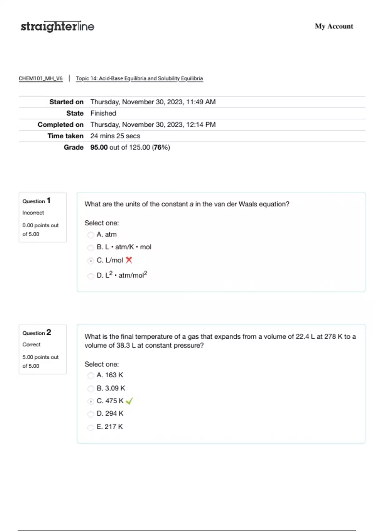 What are the units of the constant a in the van der Waals equation? Select one: A. atm B. L • atm/K • mol C. L/mol D. L2 • atm/mol2 What is the final temperature of a gas that expands from a volume of 22.4 L at 278 K to a volume of 38.3 L at constant pressure? Select one: A. 163 K B. 3.09 K C. 475 K D. 294 K E. 217 K My Account Question 3 Correct 5.00 points out of 5.00 Question 4 Correct 5.00 points out of 5.00 Question 5 Correct 5.00 points out of 5.00 A sample of carbon dioxide gas at 125°C and 248 torr occupies a volume of 275 L. What will the gas pressure be if the volume is increased to 321 L at 125°C? Select one: A. 441 torr B. 356 torr C. 212 torr D. 289 torr E. 359 torr A sample of gas occupies 24.5 L at a pressure of 1.57 atm. What is the pressure if the volume is increased to 48.3 L at constant temperature? Select one: A. 5.38 × 10–4 atm B. 1.26 atm C. 0.796 atm D. 3.10 atm E. 1.86 × 103 atm A sample of a gas occupies 1.40 L at 25°C and 760 mmHg. What volume will it occupy at the same temperature and 380 mmHg? Select one: A. 0.700 L B. 2.8 L C. 1.05 L D. 1.40 L E. 2.10 L Question 6 Correct 5.00 points out of 5.00 Question 7 Correct 5.00 points out of 5.00 Question 8 Incorrect 0.00 points out of 5.00 What is the mass, in grams, of 2.74 L of CO gas measured at 33°C and 945 mmHg? (R = 0.08206 L • atm/mol • K, 1 atm = 760 mmHg) Select one: A. 206 g B. 0.263 g C. 3.80 g D. 35.2 g E. 2.46 g Which substance has the highest vapor pressure at room temperature?