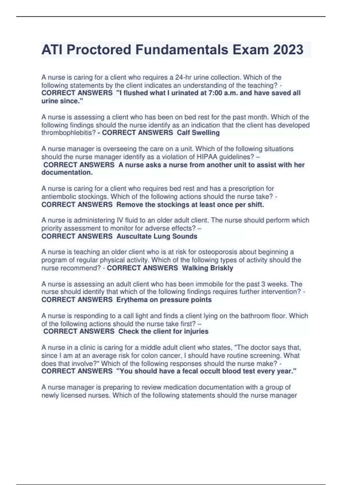 ATI Proctored Fundamentals Exam 2023 A nurse is caring for a client who requires a 24-hr urine collection. Which of the following statements by the client indicates an understanding of the teaching? - CORRECT ANSWERS "I flushed what I urinated at 7:00 a.m. and have saved all urine since." A nurse is assessing a client who has been on bed rest for the past month. Which of the following findings should the nurse identify as an indication that the client has developed thrombophlebitis? - CORRECT ANSWERS Calf Swelling A nurse manager is overseeing the care on a unit. Which of the following situations should the nurse manager identify as a violation of HIPAA guidelines? – CORRECT ANSWERS A nurse asks a nurse from another unit to assist with her documentation. A nurse is caring for a client who requires bed rest and has a prescription for antiembolic stockings. Which of the following actions should the nurse take? - CORRECT ANSWERS Remove the stockings at least once per shift. A nurse is administering IV fluid to an older adult client. The nurse should perform which priority assessment to monitor for adverse effects? – CORRECT ANSWERS Auscultate Lung Sounds A nurse is teaching an older client who is at risk for osteoporosis about beginning a program of regular physical activity. Which of the following types of activity should the nurse recommend? - CORRECT ANSWERS Walking Briskly A nurse is assessing an adult client who has been immobile for the past 3 weeks. The nurse should identify that which of the following findings requires further intervention? - CORRECT ANSWERS Erythema on pressure points A nurse is responding to a call light and finds a client lying on the bathroom floor. Which of the following actions should the nurse take first? – CORRECT ANSWERS Check the client for injuries A nurse in a clinic is caring for a middle adult client who states, "The doctor says that, since I am at an average risk for colon cancer, I should have routine screening. What does that involve?" Which of the following responses should the nurse make? - CORRECT ANSWERS "You should have a fecal occult blood test every year." A nurse manager is preparing to review medication documentation with a group of newly licensed nurses. Which of the following statements should the nurse manager