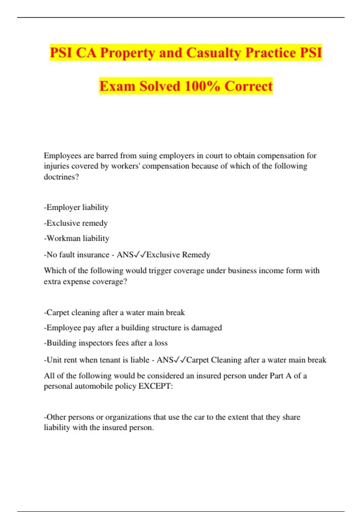 PSI CA Property and Casualty Practice PSI Exam Solved 100% Correct Employees are barred from suing employers in court to obtain compensation for injuries covered by workers' compensation because of which of the following doctrines? -Employer liability -Exclusive remedy -Workman liability -No fault insurance - ANSExclusive Remedy Which of the following would trigger coverage under business income form with extra expense coverage? -Carpet cleaning after a water main break -Employee pay after a building structure is damaged -Building inspectors fees after a loss -Unit rent when tenant is liable - ANSCarpet Cleaning after a water main break All of the following would be considered an insured person under Part A of a personal automobile policy EXCEPT: -Other persons or organizations that use the car to the extent that they share liability with the insured person. -Anyone using the insured's car with the insured's permission or the reasonable belief that they are entitled to do so. -The named insured and members of the insured's family for the ownership, maintenance and use of any auto or trailer. -Other persons or organizations for their liability from an accident involving an auto or trailer used by the insured but owned by that person or organization. - ANSOther persons or organizations for their liability from an accident involving an auto or trailer used by t