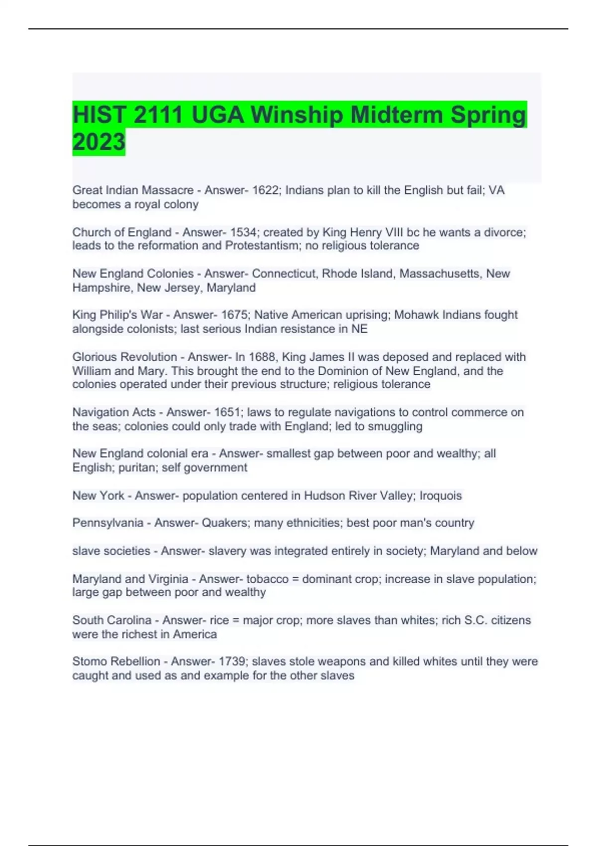 HIST 2111 UGA Winship Midterm Spring 2023 Exam Questions and Answers