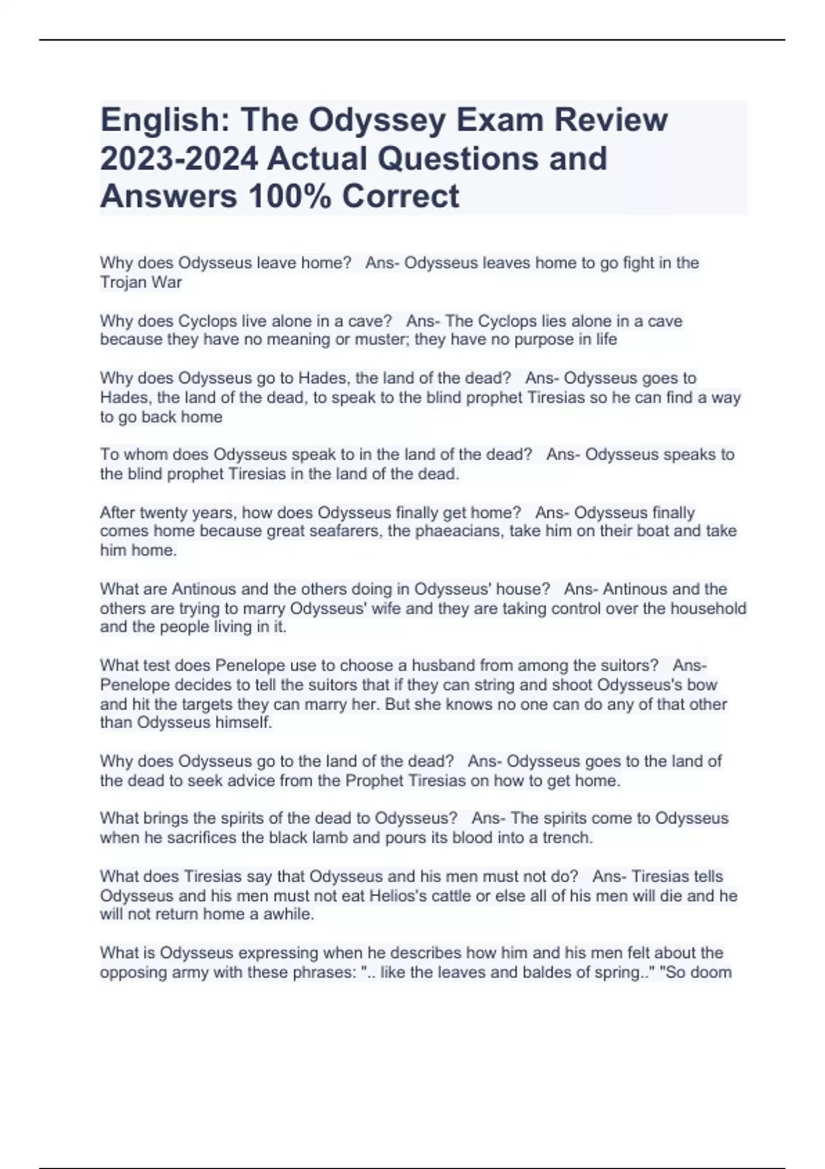 English: The Odyssey Exam Review Actual Questions and Answers 100% Correct