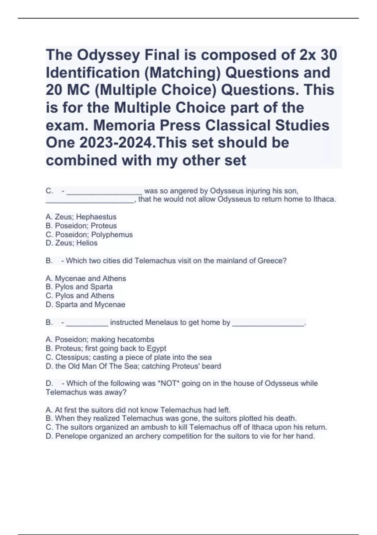 The Odyssey Final is composed of 2x 30 Identification (Matching) Questions and 20 MC (Multiple Choice) Questions. This is for the Multiple Choice part of the exam. Memoria Press Classical Studies One .This set should be combined with my other set