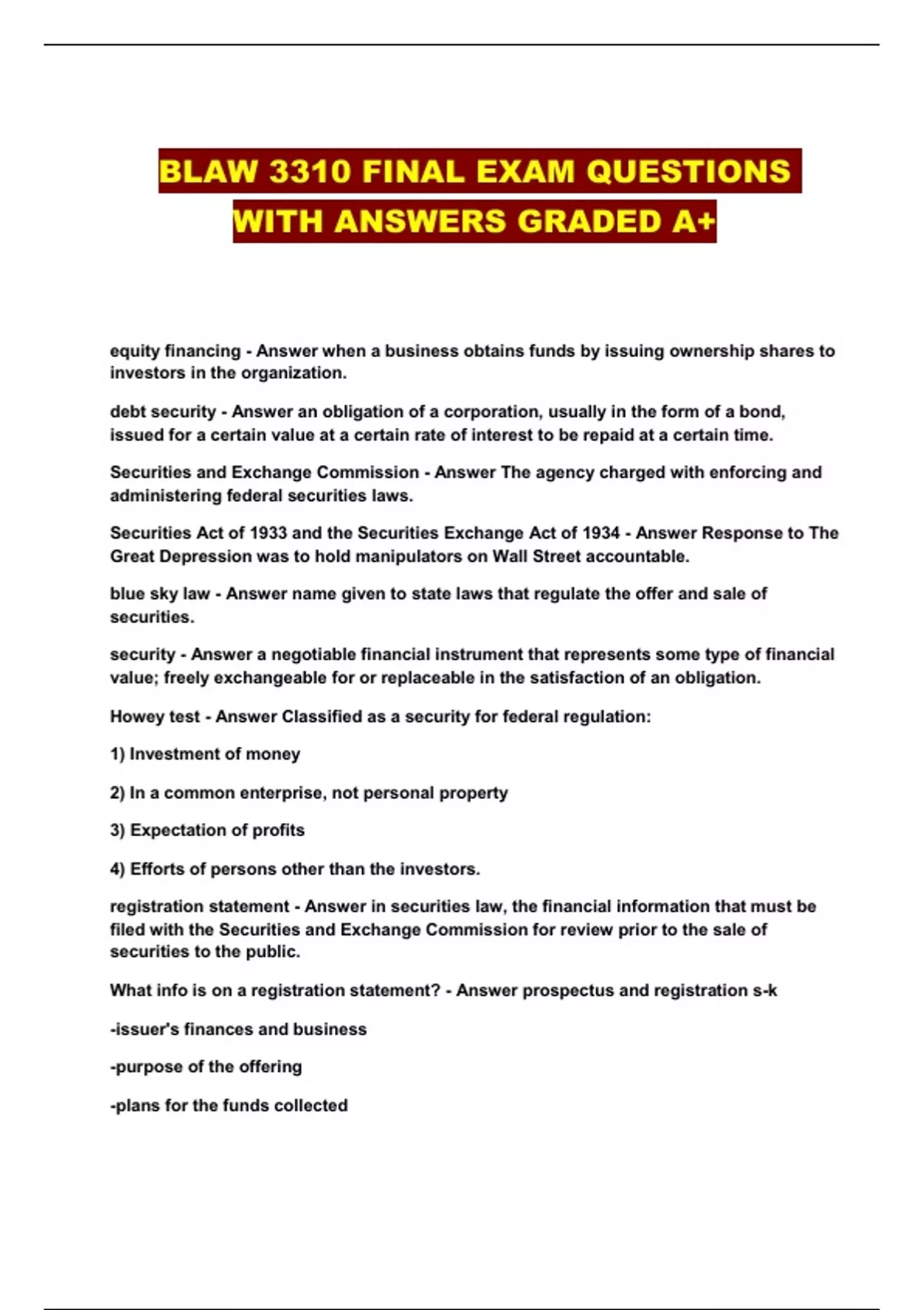 BLAW 3310 FINAL EXAM QUESTIONS WITH ANSWERS GRADED A+...