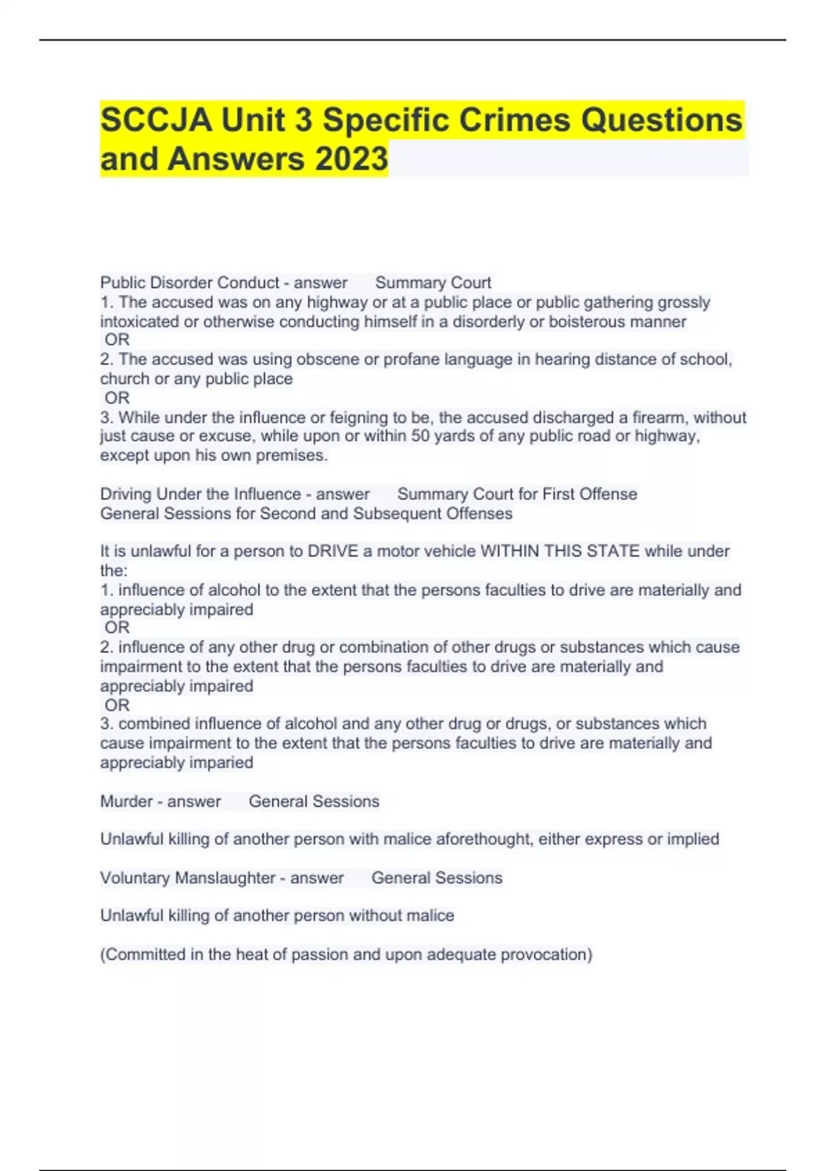 SCCJA Unit 3 Specific Crimes Questions and Answers 2023 Public Disorder Conduct Summary Court 1. The accused was on any highway or at a public place or public gathering grossly intoxicated or otherwise conducting himself in a disorderly or boisterous manner OR 2. The accused was using obscene or profane language in hearing distance of school, church or any public place OR 3. While under the influence or feigning to be, the accused discharged a firearm, without just cause or excuse, while upon or within 50 yards of any public road or highway, except upon his own premises. Driving Under the Influence Summary Court for First Offense General Sessions for Second and Subsequent Offenses It is unlawful for a person to DRIVE a motor vehicle WITHIN THIS STATE while under the: 1. influence of alcohol to the extent that the persons faculties to drive are materially and appreciably impaired OR 2. influence of any other drug or combination of other drugs or substances which cause impairment to the extent that the persons faculties to drive are materially and appreciably impaired OR 3. combined influence of alcohol and any other drug or drugs, or substances which cause impairment to the extent that the persons faculties to drive are materially and appreciably imparied Murder General Sessions Unlawful killing of another person with malice aforethought, either express or implied Voluntary Manslaughter General Sessions Unlawful killing of another person without malice (Committed in the heat of passion and upon adequate provocation) Involuntary Manslaughter General Session Unlawful killing of another person resulting from criminal negligence (reckless disregard for the safety of others) Reckless Vehicular Homicide General Sessions Unlawful killing of another person while operating a vehicle with reckless disregard of the safety of others Conviction requires revocation of DL for 5 yrs. Death of the victim must occur within 3 years. Felony DUI General Sessions 1. The actor drives a vehicle while under the influence of alcohol and/or other drugs 2. The actor does an act forbidden by law or neglects a duty imposed by law; and 3. The act or neglect proximately causes great bodily injury or death to another person Threatening Life, Person, Or Family of Public Official or Public Employee General Sessions 1. It is unlawful for a person knowingly and wilfully to deliver or convey to a public official or to a teacher or principal of an elementary or secondary school and letter or paper, writing, print, missive, document, or electronic communication or verbal or electronic communication which contains a threat to take the life of or to inflict bodily harm upon the public official, teacher, or principal, or members of his immediate family if the threat is directly related to the public officials, teachers, or principals professional responsibilities 2. It is unlawful for a person knowingly and wilfully to deliver or convey to a public employee a letter or paper, writing, print, missive, document, or electronic communication or verbal or electronic communication which contains a threat to take the life of or to inflict bodily harm upon the public employee or members of his immediate family if the threat is directly related to the public employees official responsibilities Attempted Murder General Sessions A person, with intent to kill, attempt to kill another person with malice aforethought, either expressed or implied Assault and Batter of a High and Aggravated Nature General Sessions A persons unlawfully injures another person, and 1. Great bodily injury to another person results OR 2. The act is accomplished by means likely to produce death or great bodily injury Assault and Batter 1st Degree General Sessions A person unlawfully 1. Injures another person, and the act A. Involves nonconsensual touching of the private parts of a person, either under or above clothing, with lewd and lascivious intent or B. Occurred during the commission of a robbery, burglary, kidnapping, or left OR A person offers or attempts to injure another person with the present ability to do so, and the act A. Is accomplished by means likely to produce death or great bodily injury or B. Occurred during the commission of a robbery, burglary, kidnapping or theft Assault and Battery 2nd Degree General Sessions A person unlawfully injures another person, or offers or attempts to injure another person with the present ability to do so, and 1. Moderate bodily injury to another person results or moderate bodily injury to another person could have resulted OR 2. The act involves the nonconsensual touching of the private parts of a person, either under or above clothing Assault and Battery 3rd Degree Summary Court A person unlawfully injures another person, or offers or attempts to inure another person with the present ability to do so Resisting Arrest General Sessions A person knowingly and willfully resists any lawful arrest Assault on Officer While Resisting Arrest General Session A person knowingly and willfully assaults, beats or wounds a law enforcement officer when resisting any lawful arrest Resisting Arrest with a Deadly Weapon General Session Any person who uses or threatens use of a deadly weapon against the office when such person is in possession or claims to be in possession of a deadly weapon while resisting lawful efforts of a law enforcement officer to arrest him or any other person Illegal Transportation of Alcoholic Liquors Summary Court One may not transport alcoholic liquors (distilled spirits) in a motor vehicle if the cap or seal is opened or broken in any motor vehicle except in a trunk, luggage compartment or cargo area that is separate and distinct from the drivers and passengers compartments Open Containers of Beer of Wine in a Vehicle Summary Court One may not possess an open container of beer or wine in a motor vehicle of any kind while located upon the public highways or highway rights of way of this State, except in the tr