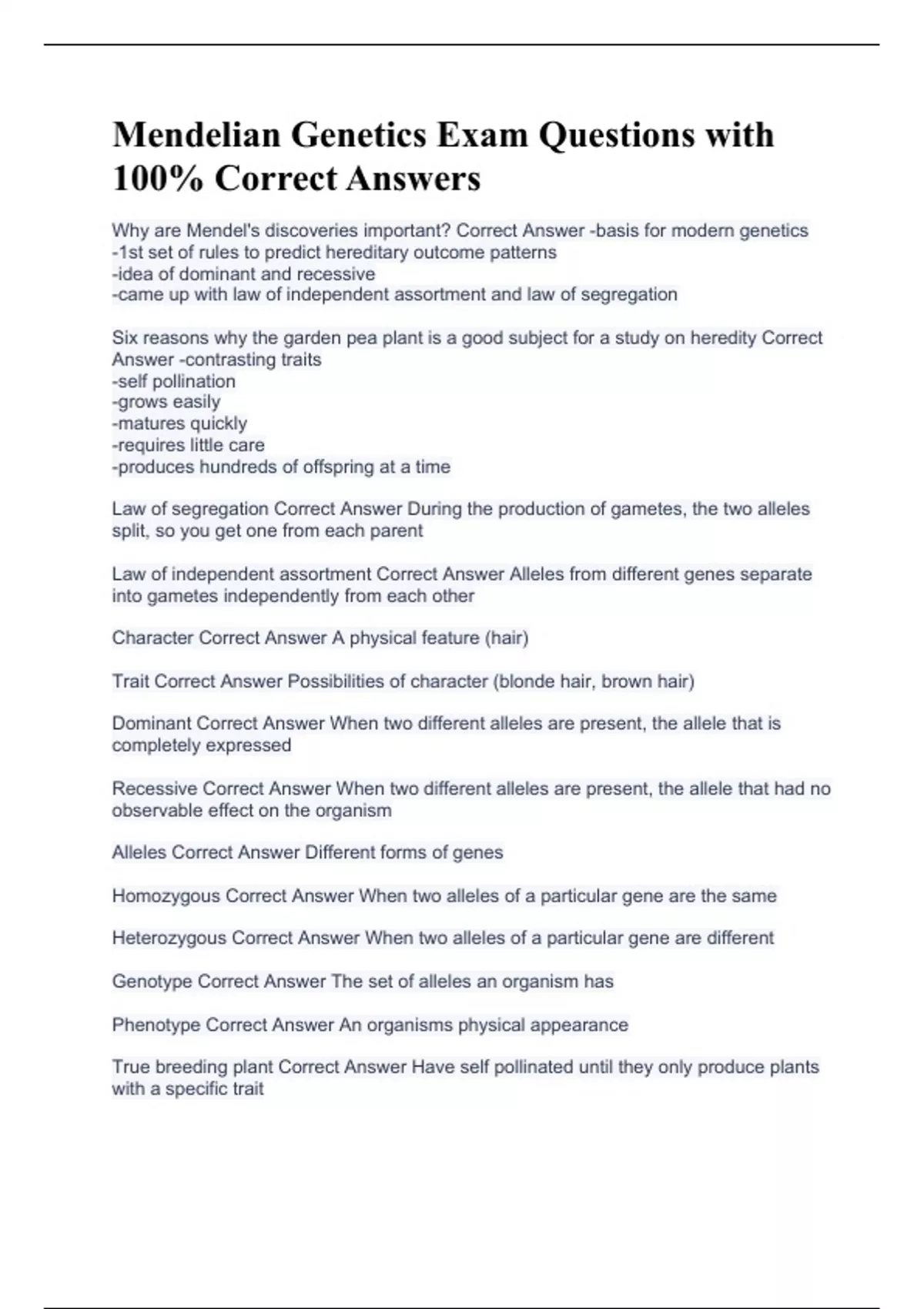 Mendelian Genetics Exam Questions with 100% Correct Answers
