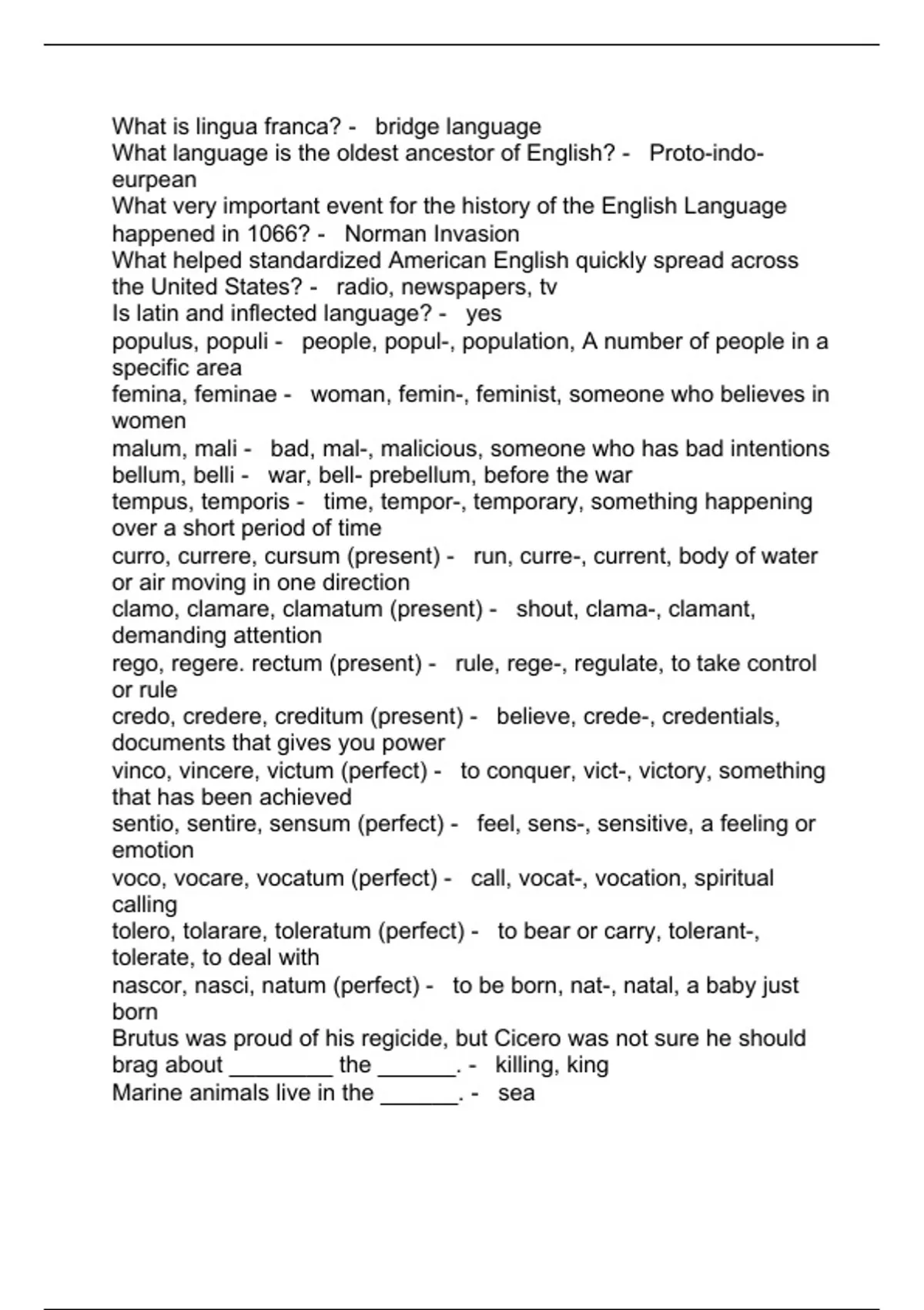 What is lingua franca? - bridge language What language is the oldest ancestor of English? - Proto-indo-eurpean What very important event for the history of the English Language happened in 1066? - Norman Invasion What helped standardized American English quickly spread across the United States? - radio, newspapers, tv Is latin and inflected language? - yes populus, populi - people, popul-, population, A number of people in a specific area femina, feminae - woman, femin-, feminist, someone who believes in women
