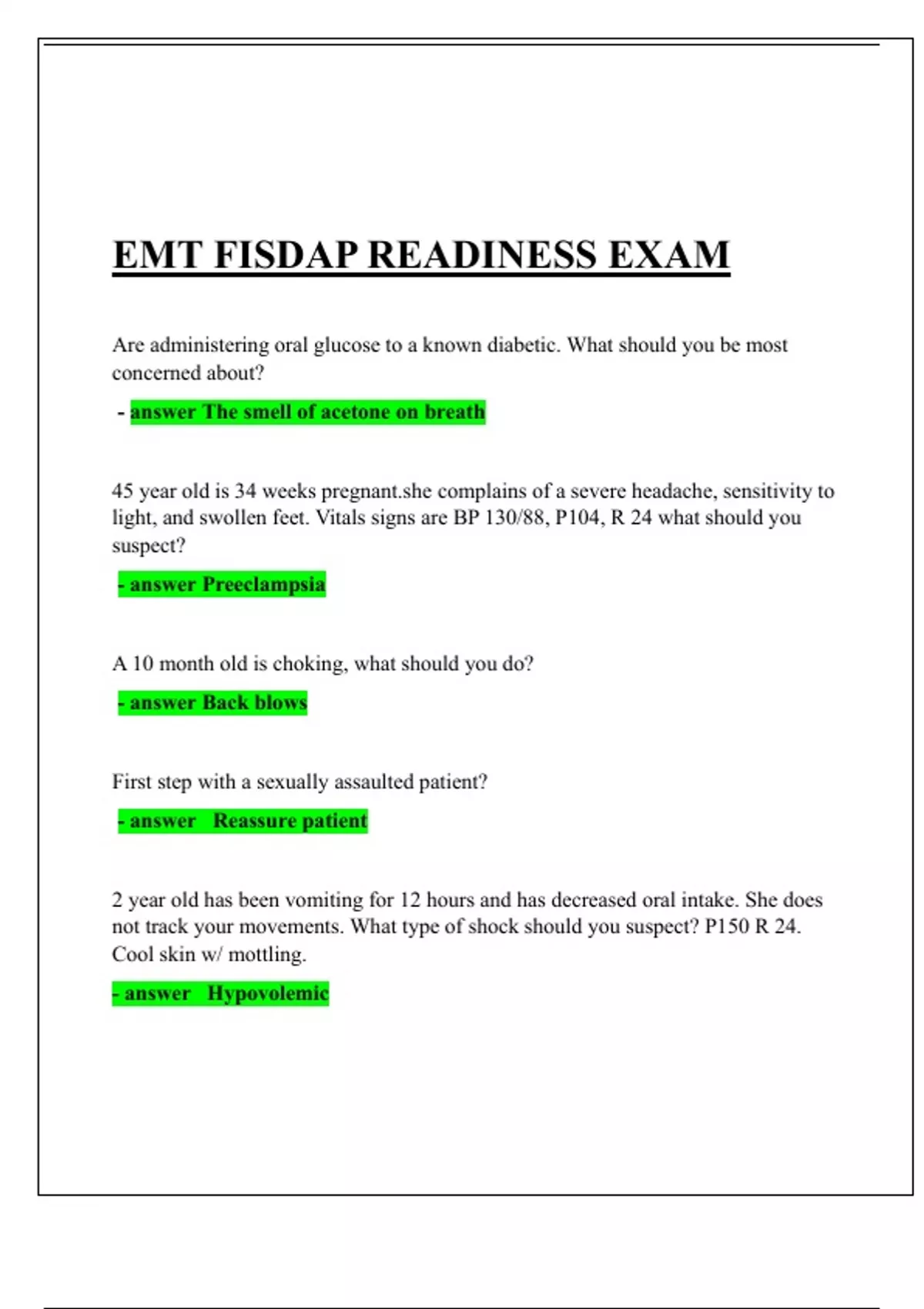 EMT FISDAP READINESS EXAM Are administering oral glucose to a known diabetic. What should you be most concerned about? - answer The smell of acetone on breath 45 year old is 34 weeks complains of a severe headache, sensitivity to light, and swollen feet. Vitals signs are BP 130/88, P104, R 24 what should you suspect? - answer Preeclampsia A 10 month old is choking, what should you do? - answer Back blows First step with a sexually assaulted patient? - answer Reassure patient 2 year old has been vomiting for 12 hours and has decreased oral intake. She does not track your movements. What type of shock should you suspect? P150 R 24. Cool skin w/ mottling. - answer Hypovolemic