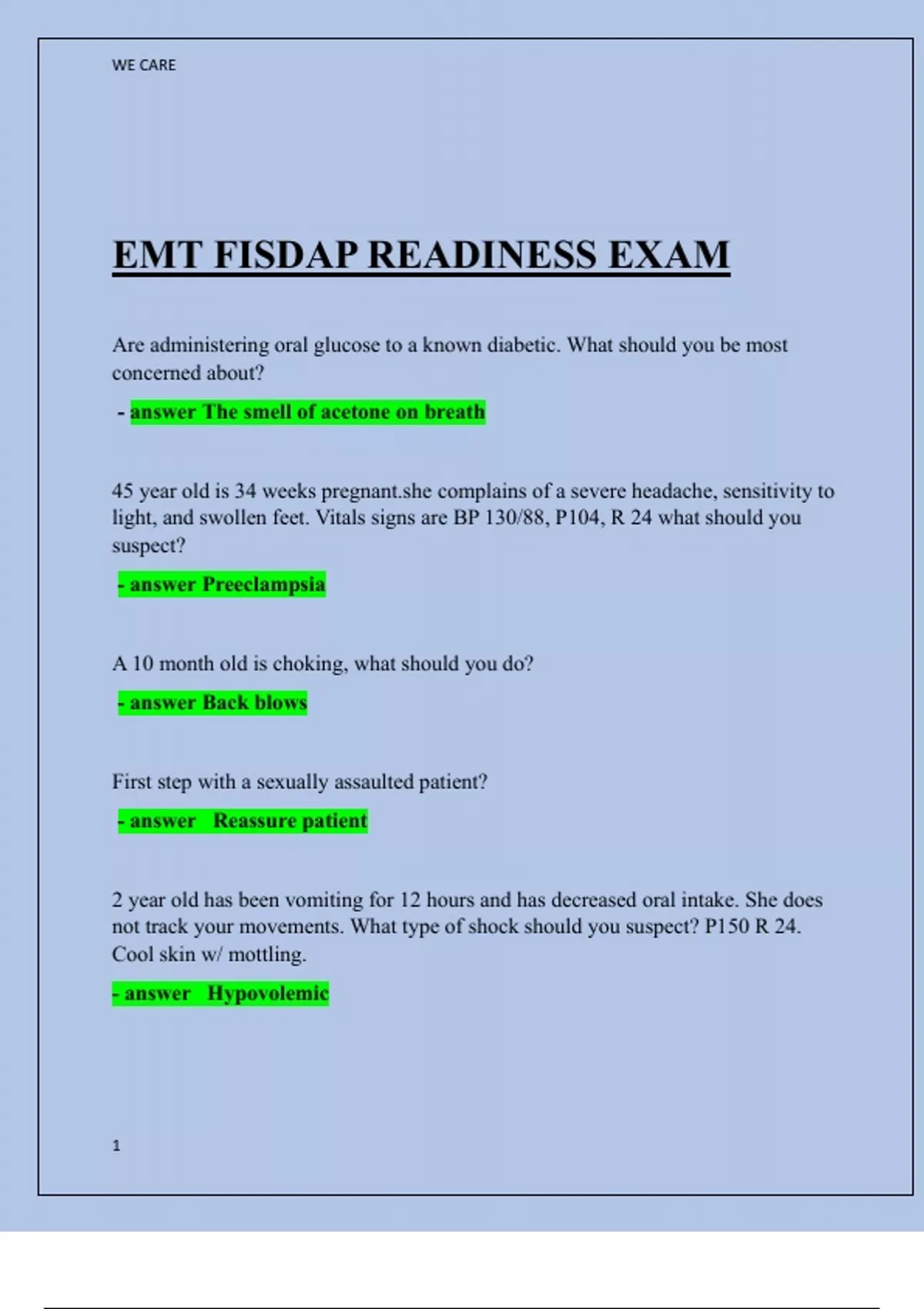 EMT FISDAP READINESS EXAM Are administering oral glucose to a known diabetic. What should you be most concerned about? - answer The smell of acetone on breath 45 year old is 34 weeks complains of a severe headache, sensitivity to light, and swollen feet. Vitals signs are BP 130/88, P104, R 24 what should you suspect? - answer Preeclampsia A 10 month old is choking, what should you do? - answer Back blows First step with a sexually assaulted patient? - answer Reassure patient 2 year old has been vomiting for 12 hours and has decreased oral intake. She does not track your movements. What type of shock should you suspect? P150 R 24. Cool skin w/ mottling. - answer Hypovolemic