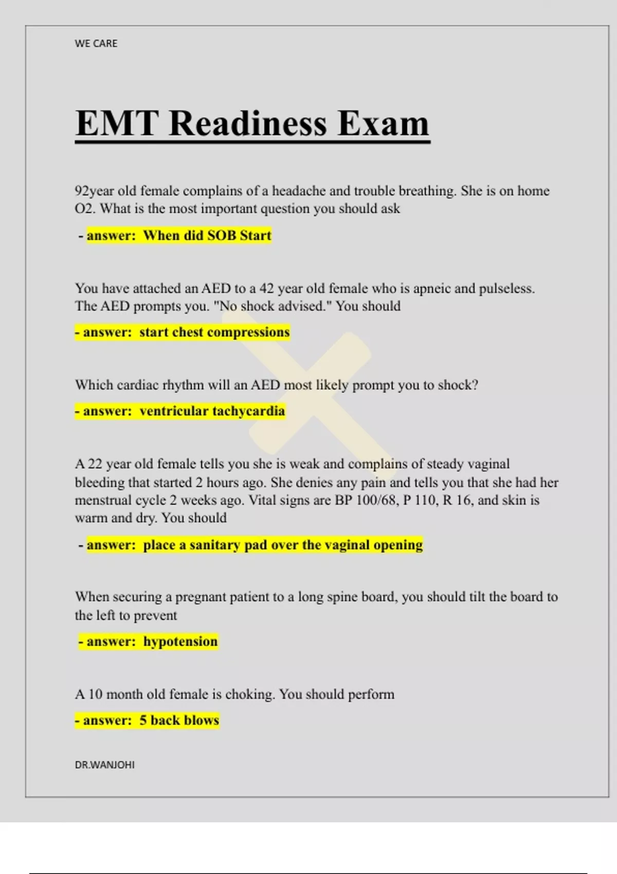 EMT Readiness Exam 92year old female complains of a headache and trouble breathing. She is on home O2. What is the most important question you should ask - answer: When did SOB Start You have attached an AED to a 42 year old female who is apneic and pulseless. The AED prompts you. "No shock advised." You should - answer: start chest compressions Which cardiac rhythm will an AED most likely prompt you to shock? - answer: ventricular tachycardia A 22 year old female tells you she is weak and complains of steady vaginal bleeding that started 2 hours ago. She denies any pain and tells you that she had her menstrual cycle 2 weeks ago. Vital signs are BP 100/68, P 110, R 16, and skin is warm and dry. You should - answer: place a sanitary pad over the vaginal opening When securing a pregnant patient to a long spine board, you should tilt the board to the left to prevent - answer: hypotension A 10 month old female is choking. You should perform - answer: 5 back blows