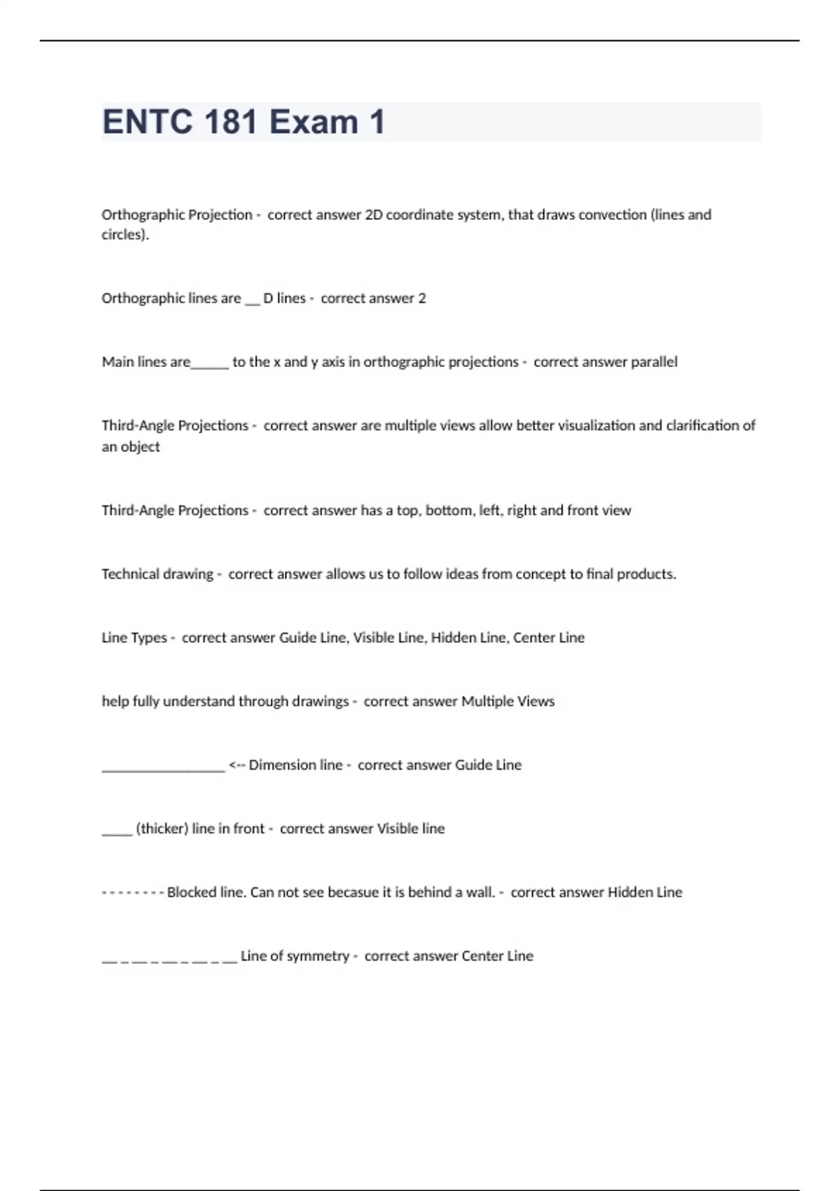 ENTC 181 Exam 1 Question and answers 100% correct 2023/2024Orthographic Projection - correct answer 2D coordinate system, that draws convection (lines and circles). Orthographic lines are __ D lines - correct answer 2 Main lines are_____ to the x and y axis in orthographic projections - correct answer parallel Third-Angle Projections - correct answer are multiple views allow better visualization and clarification of an object