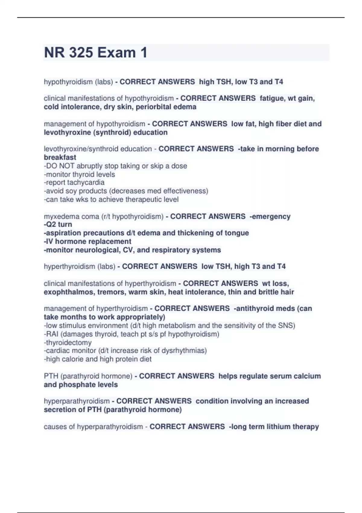 NR 325 Exam 1 hypothyroidism (labs) - CORRECT ANSWERS high TSH, low T3 and T4 clinical manifestations of hypothyroidism - CORRECT ANSWERS fatigue, wt gain, cold intolerance, dry skin, periorbital edema management of hypothyroidism - CORRECT ANSWERS low fat, high fiber diet and levothyroxine (synthroid) education levothyroxine/synthroid education - CORRECT ANSWERS -take in morning before breakfast -DO NOT abruptly stop taking or skip a dose -monitor thyroid levels -report tachycardia -avoid soy products (decreases med effectiveness) -can take wks to achieve therapeutic level myxedema coma (r/t hypothyroidism) - CORRECT ANSWERS -emergency -Q2 turn -aspiration precautions d/t edema and thickening of tongue -IV hormone replacement -monitor neurological, CV, and respiratory systems hyperthyroidism (labs) - CORRECT ANSWERS low TSH, high T3 and T4 clinical manifestations of hyperthyroidism - CORRECT ANSWERS wt loss, exophthalmos, tremors, warm skin, heat intolerance, thin and brittle hair management of hyperthyroidism - CORRECT ANSWERS -antithyroid meds (can take months to work appropriately) -low stimulus environment (d/t high metabolism and the sensitivity of the SNS) -RAI (damages thyroid, teach pt s/s pf hypothyroidism) -thyroidectomy -cardiac monitor (d/t increase risk of dysrhythmias) -high calorie and high protein diet PTH (parathyroid hormone) - CORRECT ANSWERS helps regulate serum calcium and phosphate levels hyperparathyroidism - CORRECT ANSWERS condition involving an increased secretion of PTH (parathyroid hormone) causes of hyperparathyroidism - CORRECT ANSWERS -long term lithium therapy -parathyroid tumor -radiation -vitamin D deficiencies hyperparathyroidism labs - CORRECT ANSWERS increased calcium clinical manifestations of hyperparathyroidism - CORRECT ANSWERS may be asymptomatic, shortened attention span, muscle wkness, constipation, fatigue management of hyperparathyroidism - CORRECT ANSWERS remove parathyroid gland and manage hypercalcemia complications of hyperparathyroidism - CORRECT ANSWERS -fxs (d/t increased calcium and phosphate in the blood, which decreases bone density) -renal failure -pancreatitis -osteoporosis Cushing's (labs) - CORRECT ANSWERS increased cortisol levels ***clinical manifestations of Cushing's - CORRECT ANSWERS moon face, buffalo hump, hyperglycemia, wt gain, purple striae, easily bruises, acne, HTN, hirsutism, irregular periods and/or amenorrhea management of Cushing's - CORRECT ANSWERS -transsphenoidal hyposectomy (removal of pituitary tumor) -adrenalectomy -mitotane (suppresses the synthesis of cortisol) normal fasting BG level - CORRECT ANSWERS < 100 normal post-prandial BG - CORRECT ANSWERS < 140 normal A1C - CORRECT ANSWERS < 6.5% clinical manifestations of DM II - CORRECT ANSWERS fatigue, polyuria, polydipsia, polyphagia, blurred vision, n/v management of DM II - CORRECT ANSWERS -rule of 15 -use thiazide diuretics and corticosteroids w/ caution (both effect glucose tolerance) -rules for exercise (don't exercise at peak of insulin, don't exercise w/ ketones in urine, best time to exercise is after eating d/t increase in glucose) -get yearly flu shot ***types of rapid acting insulin - CORRECT ANSWERS -lispro (Humalog