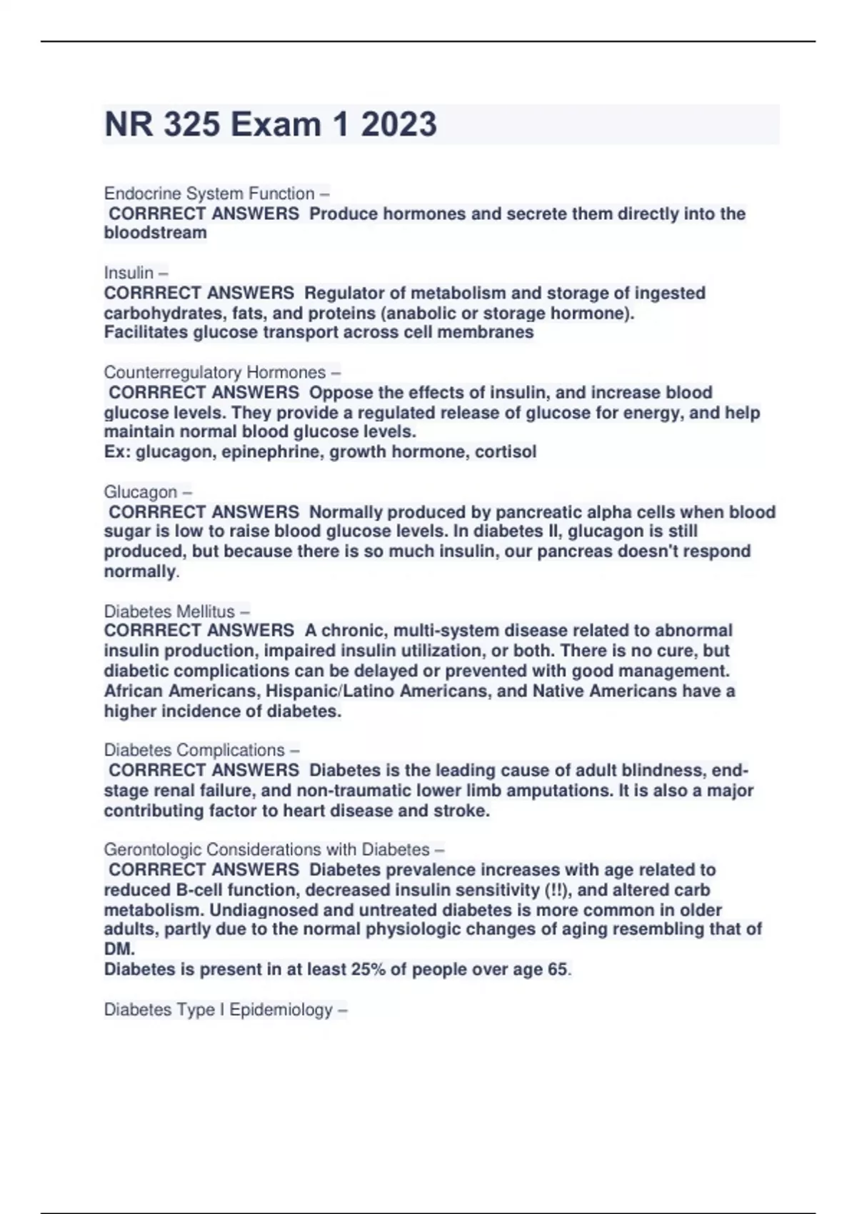 NR 325 Exam 1 2023 Endocrine System Function – CORRRECT ANSWERS Produce hormones and secrete them directly into the bloodstream Insulin – CORRRECT ANSWERS Regulator of metabolism and storage of ingested carbohydrates, fats, and proteins (anabolic or storage hormone). Facilitates glucose transport across cell membranes Counterregulatory Hormones – CORRRECT ANSWERS Oppose the effects of insulin, and increase blood glucose levels. They provide a regulated release of glucose for energy, and help maintain normal blood glucose levels. Ex: glucagon, epinephrine, growth hormone, cortisol Glucagon – CORRRECT ANSWERS Normally produced by pancreatic alpha cells when blood sugar is low to raise blood glucose levels. In diabetes II, glucagon is still produced, but because there is so much insulin, our pancreas doesn't respond normally. Diabetes Mellitus – CORRRECT ANSWERS A chronic, multi-system disease related to abnormal insulin production, impaired insulin utilization, or both. There is no cure, but diabetic complications can be delayed or prevented with good management. African Americans, Hispanic/Latino Americans, and Native Americans have a higher incidence of diabetes. Diabetes Complications – CORRRECT ANSWERS Diabetes is the leading cause of adult blindness, endstage renal failure, and non-traumatic lower limb amputations. It is also a major contributing factor to heart disease and stroke. Gerontologic Considerations with Diabetes – CORRRECT ANSWERS Diabetes prevalence increases with age related to reduced B-cell function, decreased insulin sensitivity (!!), and altered carb metabolism. Undiagnosed and untreated diabetes is more common in older adults, partly due to the normal physiologic changes of aging resembling that of DM. Diabetes is present in at least 25% of people over age 65. Diabetes Type I Epidemiology – CORRRECT ANSWERS Formerly known as "juvenile onset" or "insulin dependent" diabetes. Most often occurs in people under 40 years old, and accounts for 5-10% of all people with diabetes. Has a sudden onset. It is an autoimmune disease, in which B-cells responsible for insulin production are destroyed. A genetic predisposition and exposure to a virus are factors that may contribute to the development of DM I. Autoantibody are produced and destroy B-cells. Manifestations occur after the pancreas is unable to produced insulin, and symptoms are rapid. Usually patients present to ER with DKA. Diabetes Type I Classic Symptoms – CORRRECT ANSWERS Polyuria Polydipsia Polyphagia Weight loss Prediabetes – CORRRECT ANSWERS Known as impaired glucose tolerance (IGT) or impaired fasting glucose (IFG). Prediabetes Labs – CORRRECT ANSWERS IFG: fasting glucose levels 100-126 mg/dl IGT: 2 hour plasma glucose 140-199 mg/dl A1C: in the range of 5.7-6.4% A1C Lab – CORRRECT ANSWERS It is a test that determines how well your glucose was stabilized within the last three months. If you have a high A1C, that means you have had high glucose levels in the last 3 months Diabetes Type II Etiology – CORRRECT ANSWERS Probably has a genetic basis. A genetic mutation leading to insulin resistance, and as the disease progresses, less insulin production. There is also an increased risk for obesity. Obesity is the most powerful risk factor, especially obesity with an increased waist circumference. Type II DM is now being seen in children due to epidemic of childhood obesity. Type II accounts for 90% of diabetics. Pancreas continues to produce insulin, but the body can't
