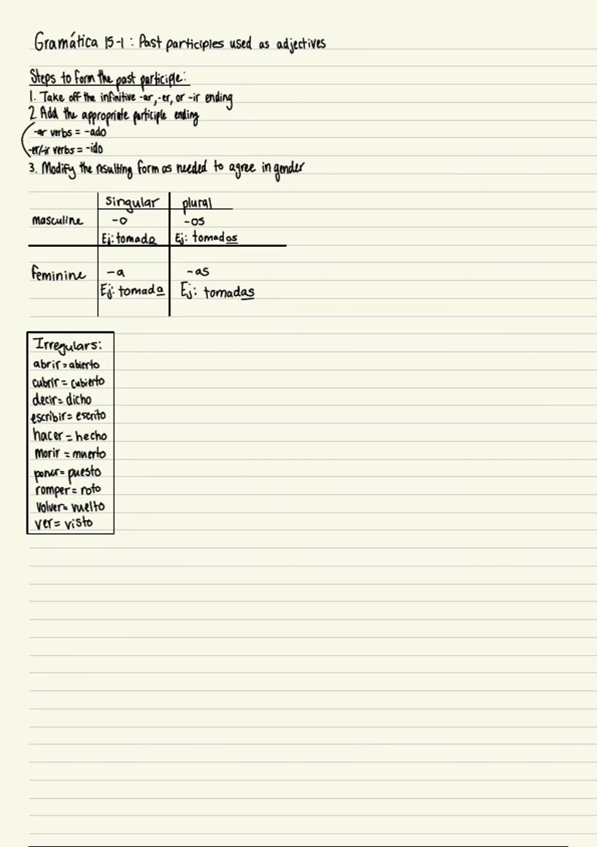 SPAN 1020 Past participles Notes. Helpful for quizzes and exams.
