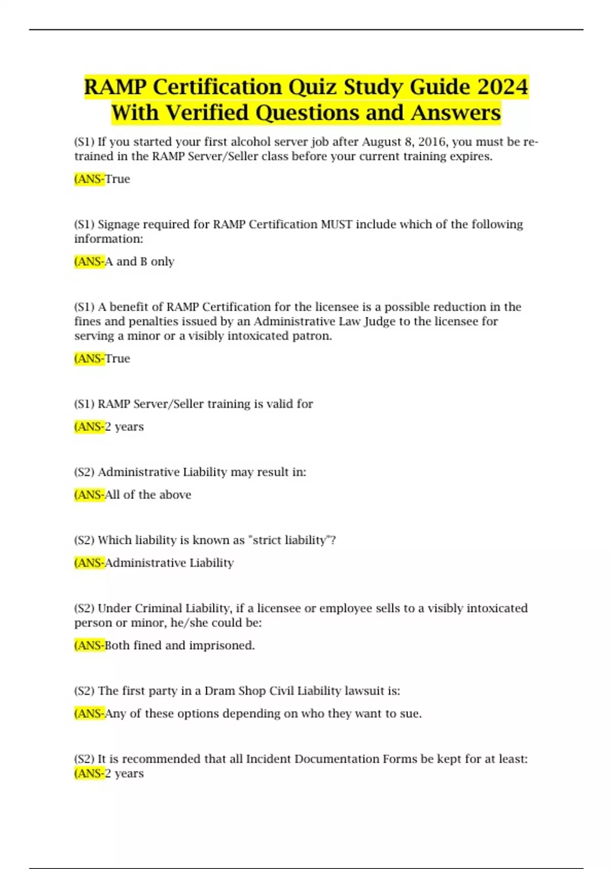 RAMP Certification Quiz Study Guide 2024 With Verified Questions and Answers (S1) If you started your first alcohol server job after August 8, 2016, you must be re-trained in the RAMP Server/Seller class before your current training expires. (ANS-True (S1) Signage required for RAMP Certification MUST include which of the following information: (ANS-A and B only (S1) A benefit of RAMP Certification for the licensee is a possible reduction in the fines and penalties issued by an Administrative Law Judge to the licensee for serving a minor or a visibly intoxicated patron. (ANS-True