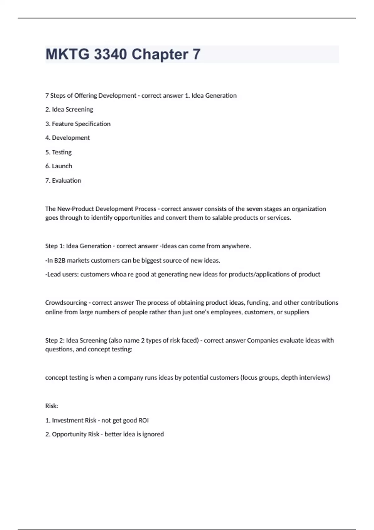 MKTG 3340 Chapter 77 Steps of Offering Development - correct answer 1. Idea Generation 2. Idea Screening 3. Feature Specification 4. Development 5. Testing 6. Launch 7. Evaluation The New-Product Development Process - correct answer consists of the seven stages an organization goes through to identify opportunities and convert them to salable products or services. Step 1: Idea Generation - correct answer -Ideas can come from anywhere. -In B2B markets customers can be biggest source of new ideas. -Lead users: customers whoa re good at generating new ideas for products/applications of product Crowdsourcing - correct answer The process of obtaining product ideas, funding, and other contributions online from large numbers of people rather than just one's employees, customers, or suppliers Step 2: Idea Screening (also name 2 types of risk faced) - correct answer Companies evaluate ideas with questions, and concept testing: concept testing is when a company runs ideas by potential customers (focus groups, depth interviews) Risk: 1. Investment Risk - not get good ROI 2. Opportunity Risk - better idea is ignored