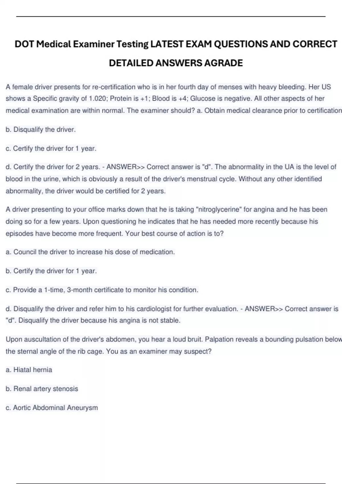 DOT Medical Examiner Testing LATEST EXAM QUESTIONS AND CORRECT DETAILED ANSWERS