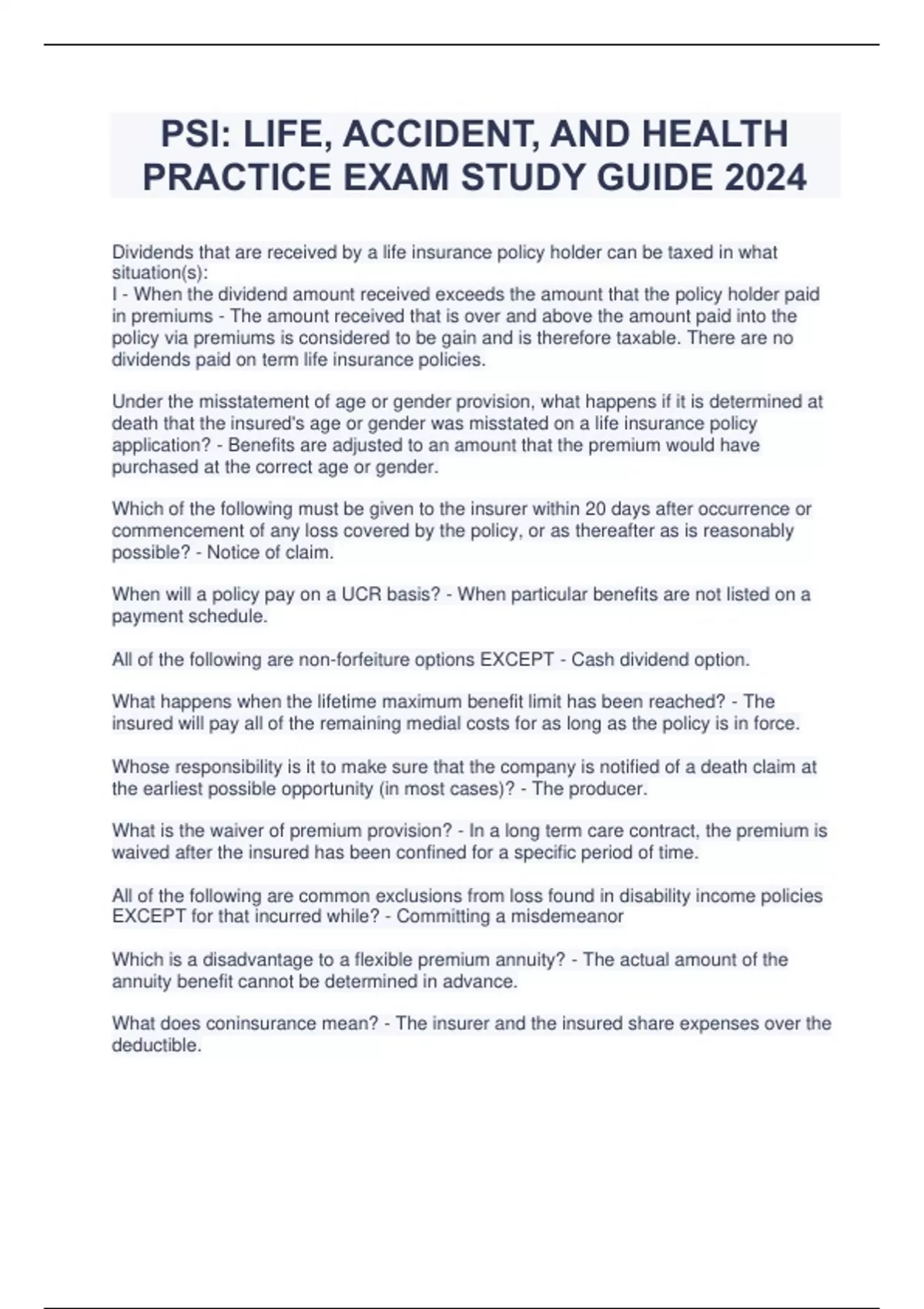 PSI: LIFE, ACCIDENT, AND HEALTH PRACTICE EXAM STUDY GUIDE 2024