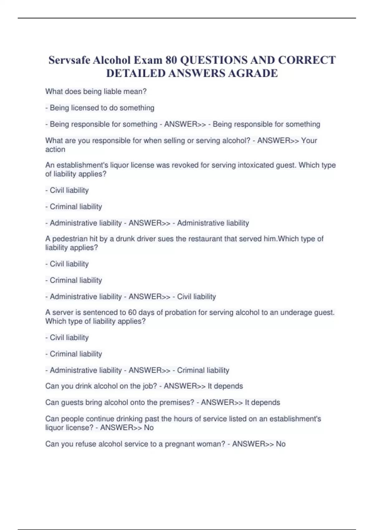 Servsafe Alcohol Exam 80 QUESTIONS AND CORRECT DETAILED ANSWERS AGRADE.