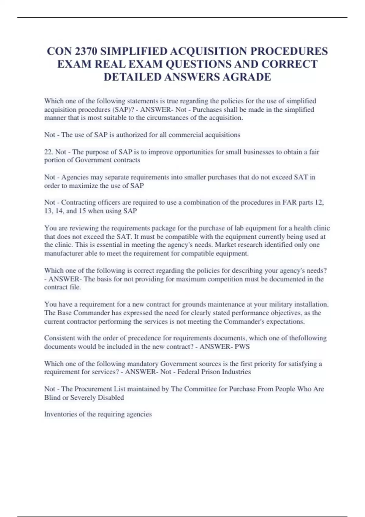 CON 2370 SIMPLIFIED ACQUISITION PROCEDURES EXAM REAL EXAM QUESTIONS AND CORRECT DETAILED ANSWERS AGRADE