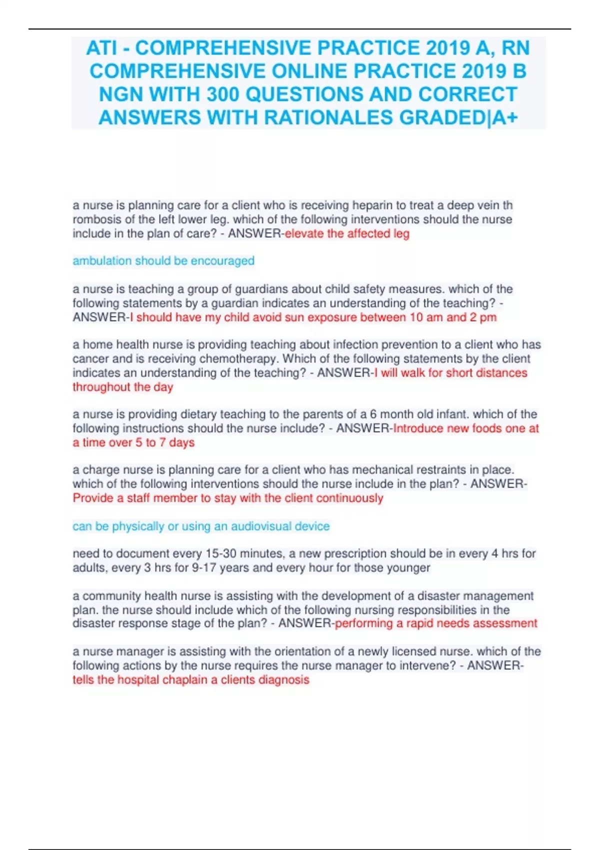 ATI - COMPREHENSIVE PRACTICE 2019 A, RN COMPREHENSIVE ONLINE PRACTICE 2019 B NGN WITH 300 QUESTIONS AND CORRECT ANSWERS WITH RATIONALES GRADED A+