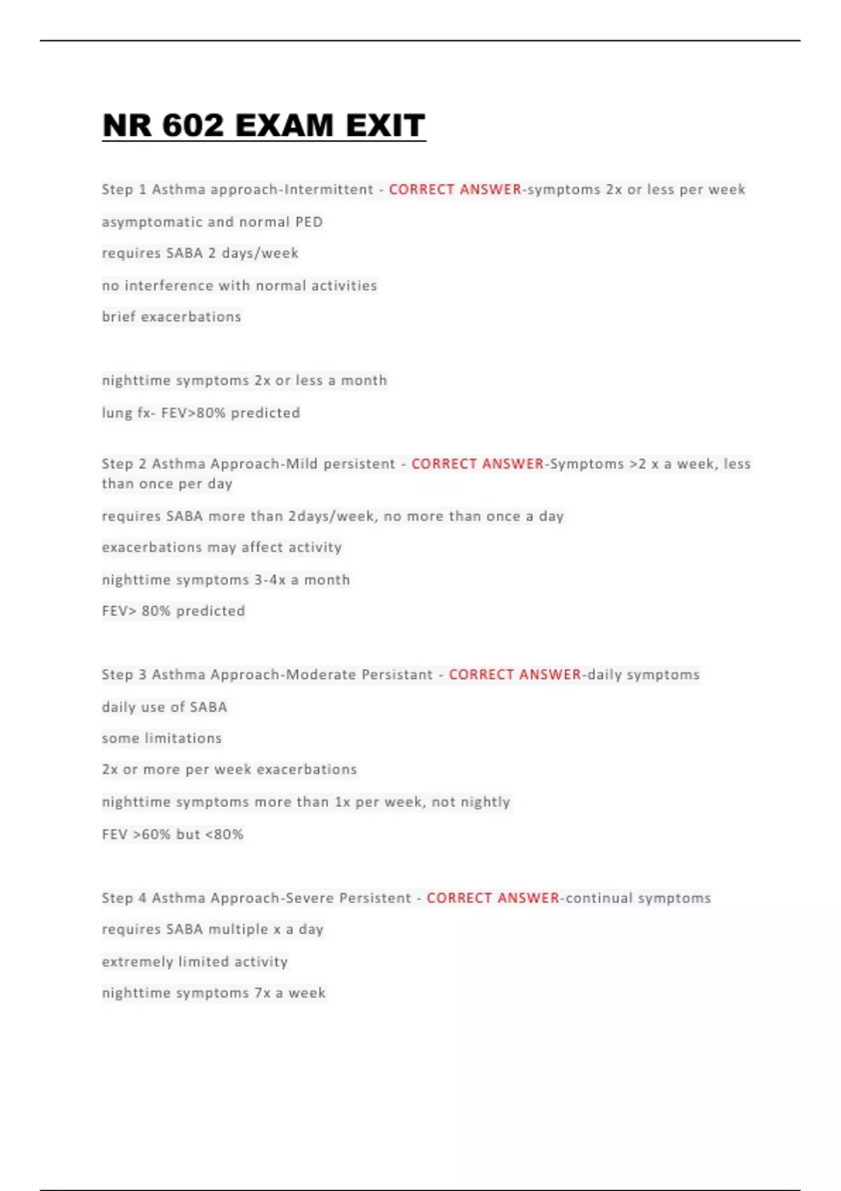 NR 602 EXAM EXIT Step 1 Asthma approach-Intermittent - CORRECT ANSWER-symptoms 2x or less per week asymptomatic and normal PED requires SABA 2 days/week no interference with normal activities brief exacerbations nighttime symptoms 2x or less a month lung fx- FEV>80% predicted Step 2 Asthma Approach-Mild persistent - CORRECT ANSWER-Symptoms >2 x a week, less than once per day requires SABA more than 2days/week, no more than once a day exacerbations may affect activity nighttime symptoms 3-4x a month FEV> 80% predicted Step 3 Asthma Approach-Moderate Persistant - CORRECT ANSWER-daily symptoms daily use of SABA some limitations 2x or more per week exacerbations nighttime symptoms more than 1x per week, not nightly FEV >60% but <80% Step 4 Asthma Approach-Severe Persistent - CORRECT ANSWER-continual symptoms requires SABA multiple x a day extremely limited activity nighttime symptoms 7x a wee