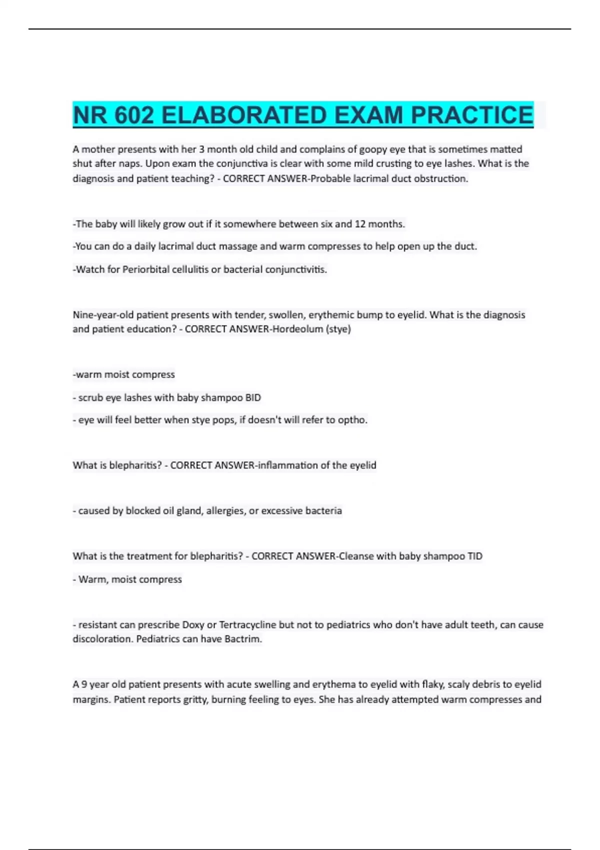 NR 602 ELABORATED EXAM PRACTICE A mother presents with her 3 month old child and complains of goopy eye that is sometimes matted shut after naps. Upon exam the conjunctiva is clear with some mild crusting to eye lashes. What is the diagnosis and patient teaching? - CORRECT ANSWER-Probable lacrimal duct obstruction. -The baby will likely grow out if it somewhere between six and 12 months. -You can do a daily lacrimal duct massage and warm compresses to help open up the duct. -Watch for Periorbital cellulitis or bacterial conjunctivitis. Nine-year-old patient presents with tender, swollen, erythemic bump to eyelid. What is the diagnosis and patient education? - CORRECT ANSWER-Hordeolum (stye) -warm moist compress - scrub eye lashes with baby shampoo BID - eye will feel better when stye pops, if doesn't will refer to optho. What is blepharitis? - CORRECT ANSWER-inflammation of the eyelid - caused by blocked oil gland, allergies, or excessive bacteria What is the treatment for blepharitis? - CORRECT ANSWER-Cleanse with baby shampoo TID - Warm, moist compress - resistant can prescribe Doxy or Tertracycline but not to pediatrics who don't have adult teeth, can cause discoloration. Pediatrics can have Bactrim. A 9 year old patient presents with acute swelling and erythema to eyelid with flaky, scaly debris to eyelid margins. Patient reports gritty, burning feeling to eyes. She has already attempted warm compresses and