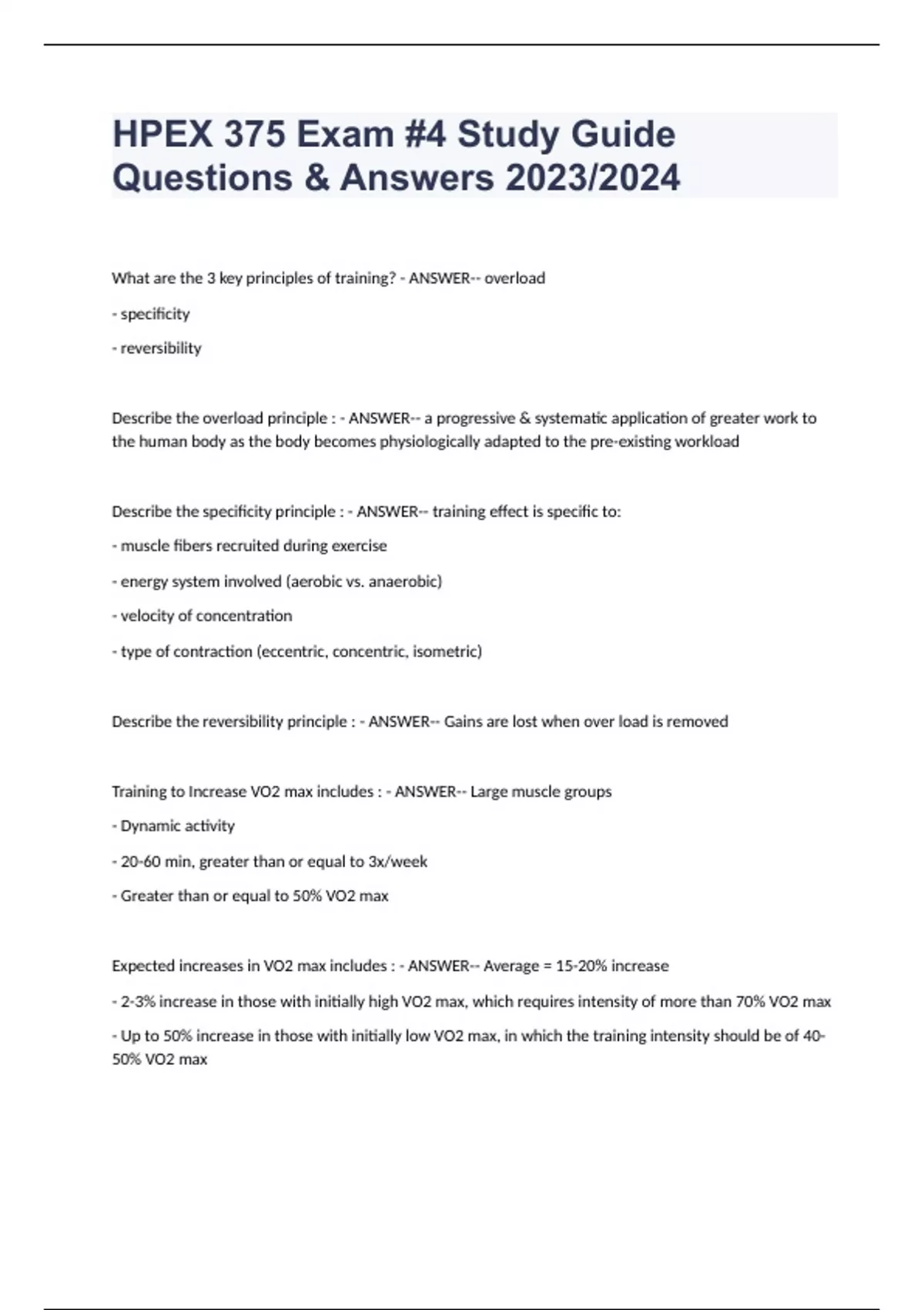 HPEX 375 Exam #4 Study Guide Questions & Answers 2023/2024 What are the 3 key principles of training? - ANSWER-- overload - specificity - reversibility Describe the overload principle : - ANSWER-- a progressive & systematic application of greater work to the human body as the body becomes physiologically adapted to the pre-existing workload Describe the specificity principle : - ANSWER-- training effect is specific to: - muscle fibers recruited during exercise - energy system involved (aerobic vs. anaerobic) - velocity of concentration - type of contraction (eccentric, concentric, isometric) Describe the reversibility principle : - ANSWER-- Gains are lost when over load is removed Training to Increase VO2 max includes : - ANSWER-- Large muscle groups - Dynamic activity - 20-60 min, greater than or equal to 3x/week - Greater than or equal to 50% VO2 max Expected increases in VO2 max includes : - ANSWER-- Average = 15-20% increase - 2-3% increase in those with initially high VO2 max, which requires intensity of more than 70% VO2 max - Up to 50% increase in those with initially low VO2 max, in which the training intensity should be of 40-50% VO2 max