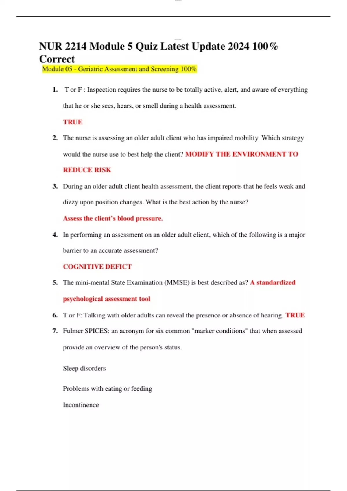 lOMoAR cPSD|18211884 lOMoAR cPSD|18211884 NUR 2214 Module 5 Q uiz L atest U pdate 2024 100% Correct Module 05 - Geriatric Assessment and Screening 100% 1. T or F : Inspection requires the nurse to be totally active, alert, and aware of everything that he or she sees, hears, or smell during a health assessment. TRUE 2. The nurse is assessing an older adult client who has impaired mobility. Which strategy would the nurse use to best help the client? MODIFY THE ENVIRONMENT TO REDUCE RISK 3. During an older adult client health assessment, the client reports that he feels weak and dizzy upon position changes. What is the best action by the nurse? Assess the client’s blood pressure. 4. In performing an assessment on an older adult client, which of the following is a major barrier to an accurate assessment? COGNITIVE DEFICT 5. The mini -mental State Examination (MMSE) is best described as? A standardized psychological assessment tool 6. T or F: Talking with older adults can reveal the presence or absence of hearing. TRUE 7. Fulmer SPICES: an acronym for six common "marker conditions" that when assessed provide an overview of the person's status. Sleep disorders Problems with eating or feeding Incontinence