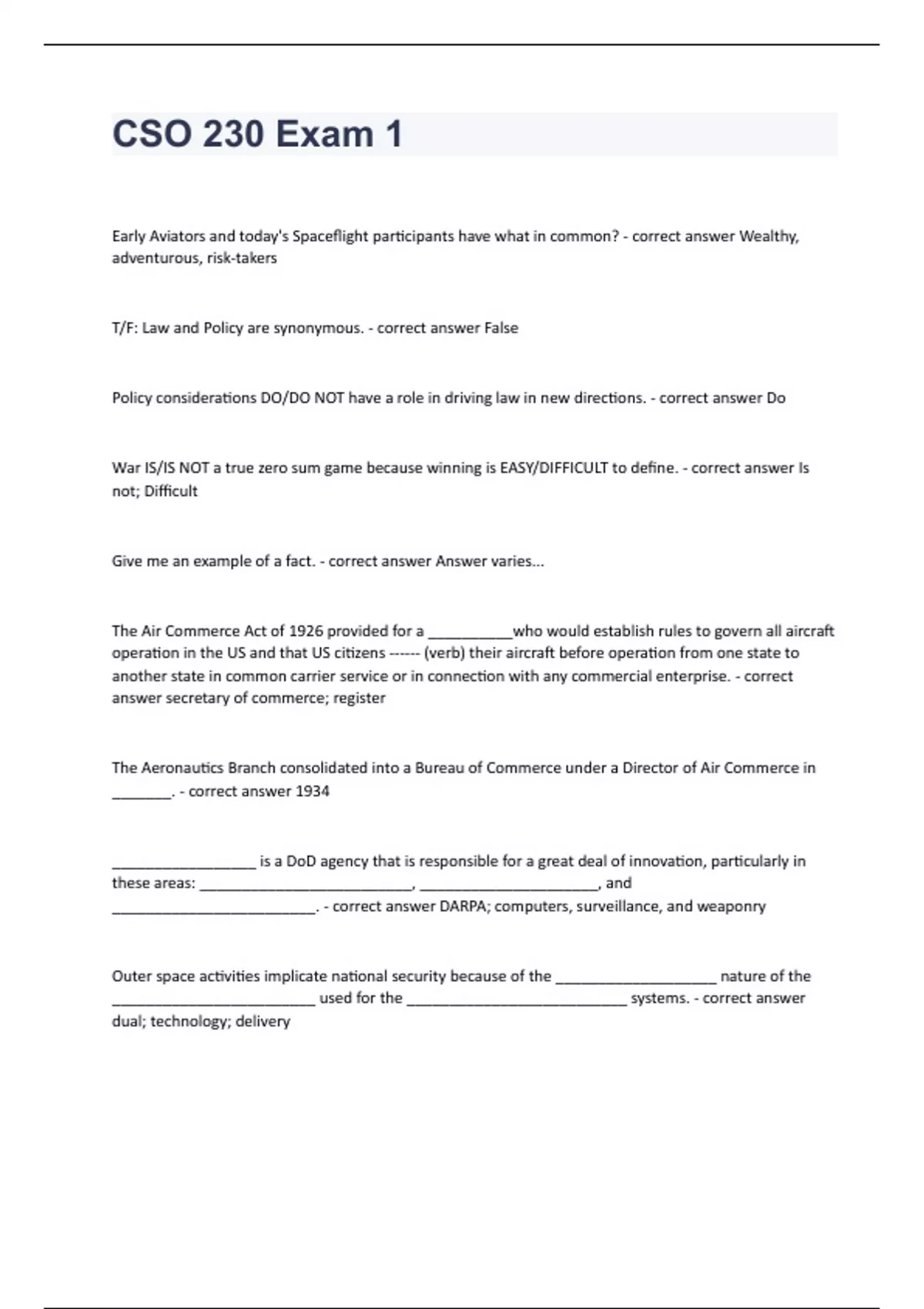 CSO 230 Exam 1 Question and answers already passed 2023/2024Early Aviators and today's Spaceflight participants have what in common? - correct answer Wealthy, adventurous, risk-takers T/F: Law and Policy are synonymous. - correct answer False Policy considerations DO/DO NOT have a role in driving law in new directions. - correct answer Do War IS/IS NOT a true zero sum game because winning is EASY/DIFFICULT to define. - correct answer Is not; Difficult