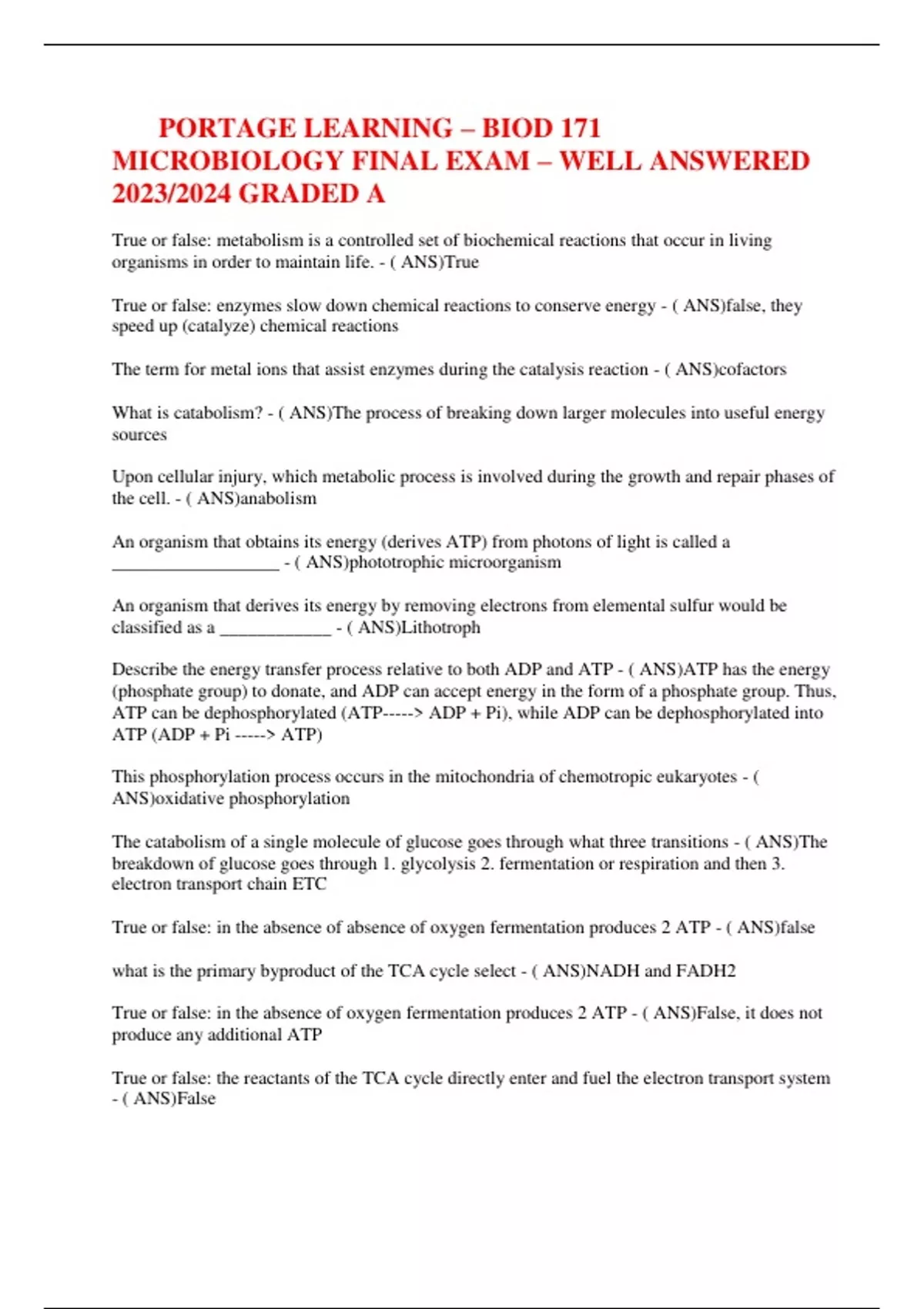 PORTAGE LEARNING – BIOD 171 MICROBIOLOGY FINAL EXAM – WELL ANSWERED 2023/2024 GRADED A PORTAGE LEARNING – BIOD 171 MICROBIOLOGY FINAL EXAM – WELL ANSWERED 2023/2024 GRADED A
