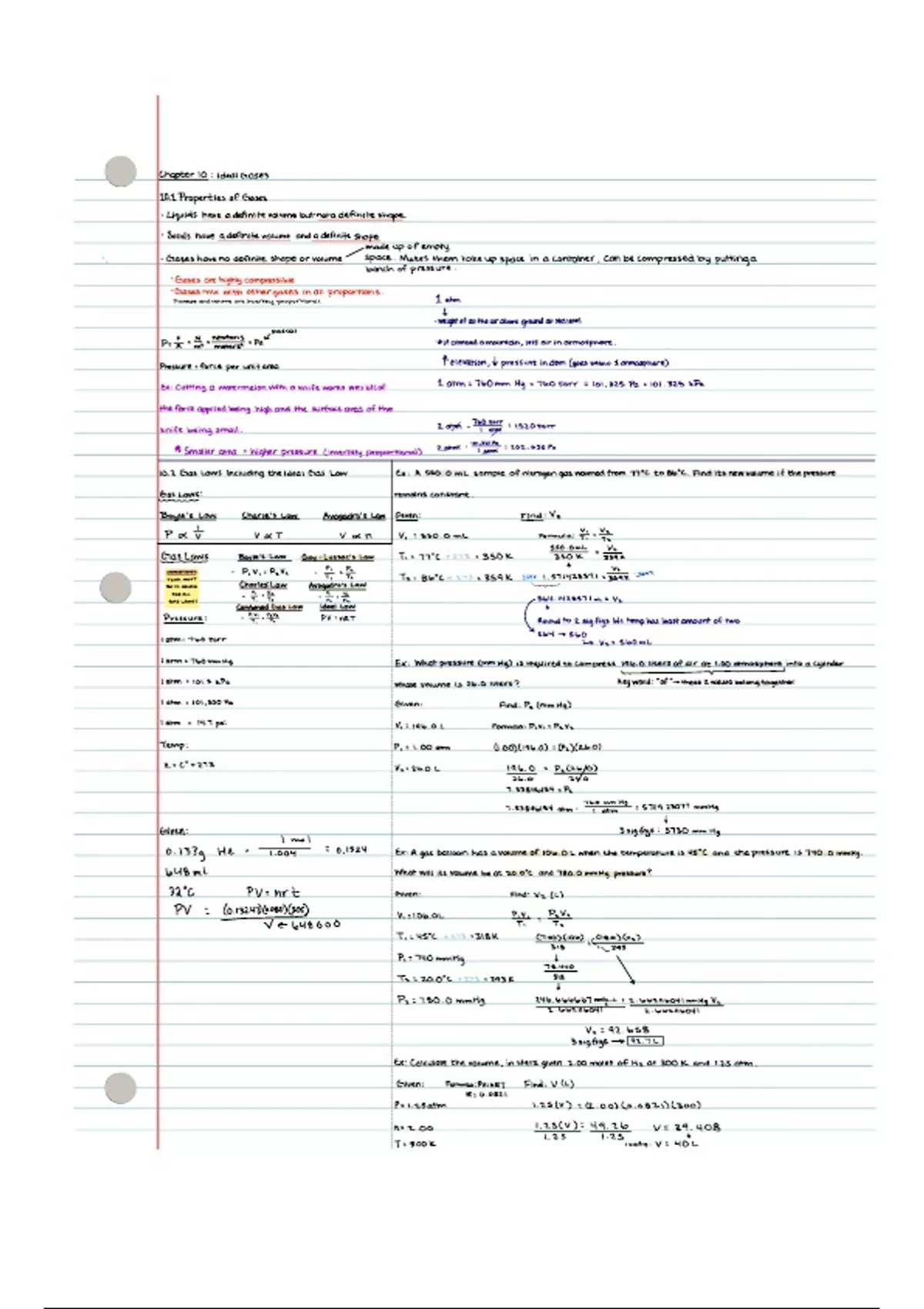 Chapter 10 covers the equation for ideal gases pv=nrt. Shows 6 different gas laws and practice examples.