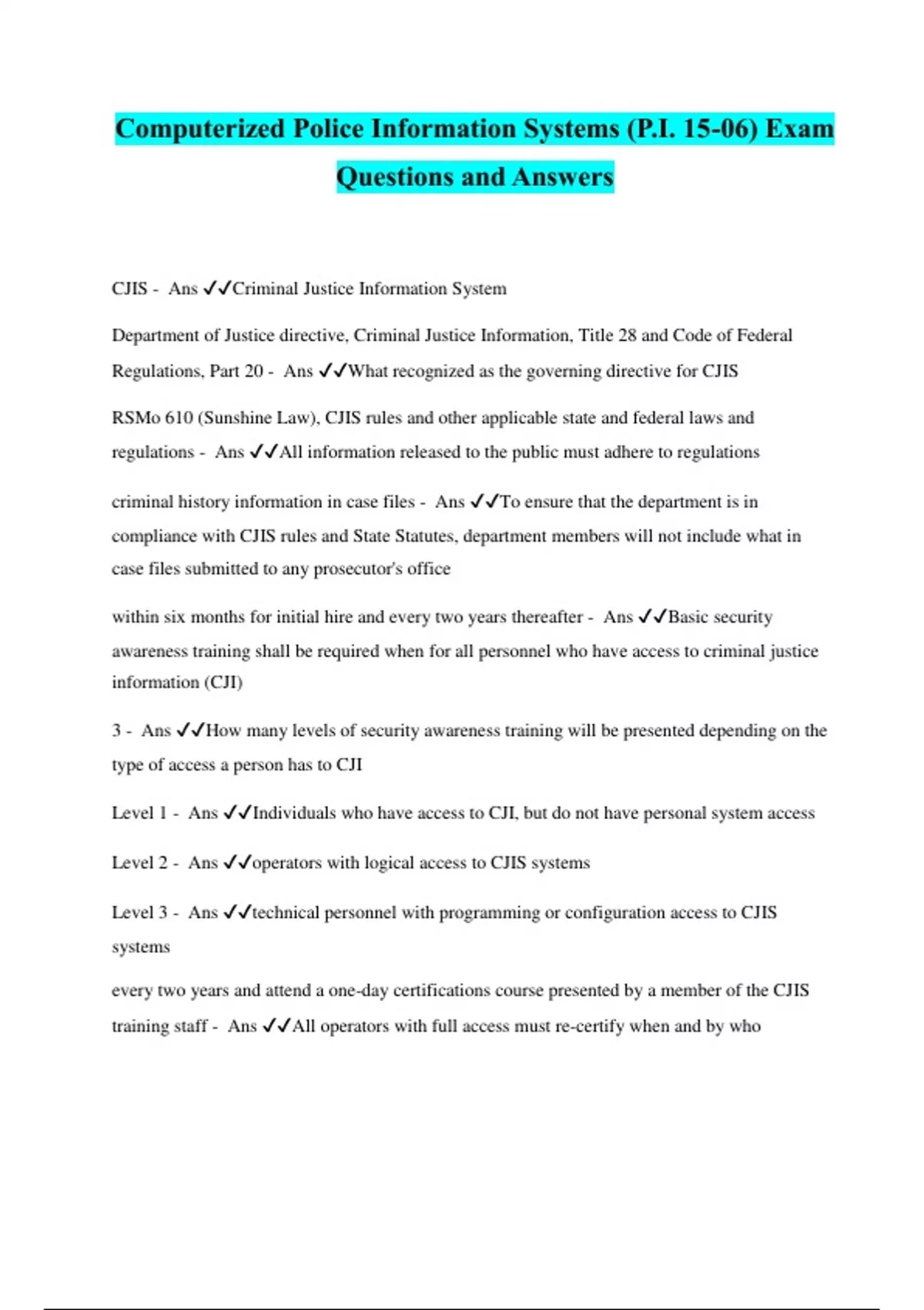 Computerized Police Information Systems (P.I. 15-06) Exam Questions and Answers CJIS - Ans ️️ Criminal Justice Information System Department of Justice directive, Criminal Justice Information, Title 28 and Code of Federal Regulations, Part 20 - Ans ️️ What recognized as the governing directive for CJIS RSMo 610 (Sunshine Law), CJIS rules and other applicable state and federal laws and regulations - Ans ️️ All information released to the public must adhere to regulations criminal history information in case files - Ans ️️ To ensure that the department is in compliance with CJIS rules and State Statutes, department members will not include what in case files submitted to any prosecutor's office within six months for initial hire and every two years thereafter - Ans ️️ Basic security awareness training shall be required when for all personnel who have access to criminal justice information (CJI) 3 - Ans ️️ How many levels of security awareness training will be presented depending on the type of access a person has to CJI Level 1 - Ans ️️ Individuals who have access to CJI, but do not have personal system access Level 2 - Ans ️️ operators with logical access to CJIS systems Level 3 - Ans ️️ technical personnel with programming or configuration access to CJIS systems every two years and attend a one-day certifications course presented by a member of the CJIS training staff - Ans ️️ All operators with full access must re-certify when and by who