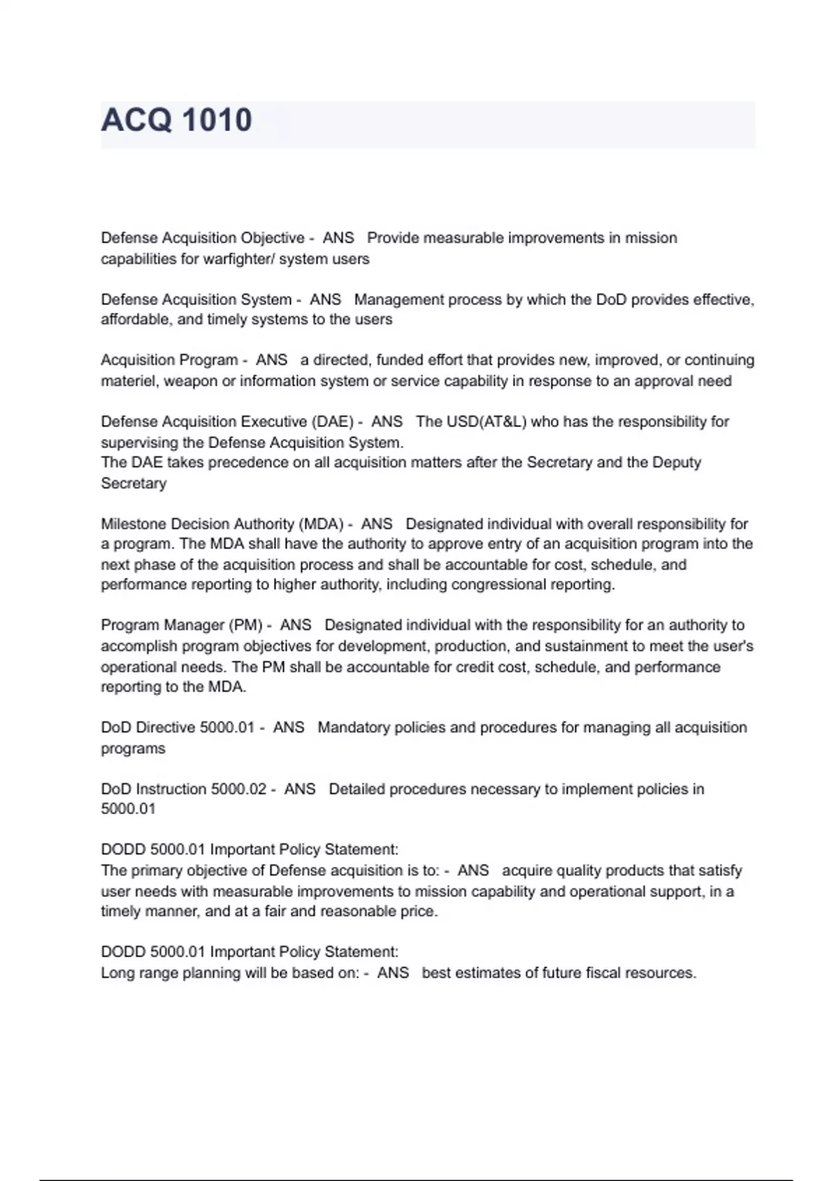Defense Acquisition University: ACQ- ACQ Questions And Answers Defense Acquisition Objective - ANS Provide measurable improvements in mission capabilities for warfighter/ system users Defense Acquisition System - ANS Management process by which the DoD provides effective, affordable, and timely systems to the users Acquisition Program - ANS a directed, funded effort that provides new, improved, or continuing materiel, weapon or information system or service capability in response to an approval need Defense Acquisition Executive (DAE) - ANS The USD(AT&L) who has the responsibility for supervising the Defense Acquisition System. The DAE takes precedence on all acquisition matters after the Secretary and the Deputy Secretary Milestone Decision Authority (MDA) - ANS Designated individual with overall responsibility for a program. The MDA shall have the authority to approve entry of an acquisition program into the next phase of the acquisition process and shall be accountable for cost, schedule, and performance reporting to higher authority, including congressional reporting. Program Manager (PM) - ANS Designated individual with the responsibility for an authority to accomplish program objectives for development, production, and sustainment to meet the user's operational needs. The PM shall be accountable for credit cost, schedule, and performance reporting to the MDA. DoD Directive 5000.01 - ANS Mandatory policies and procedures for managing all acquisition programs DoD Instruction 5000.02 - ANS Detailed procedures necessary to implement policies in 5000.01