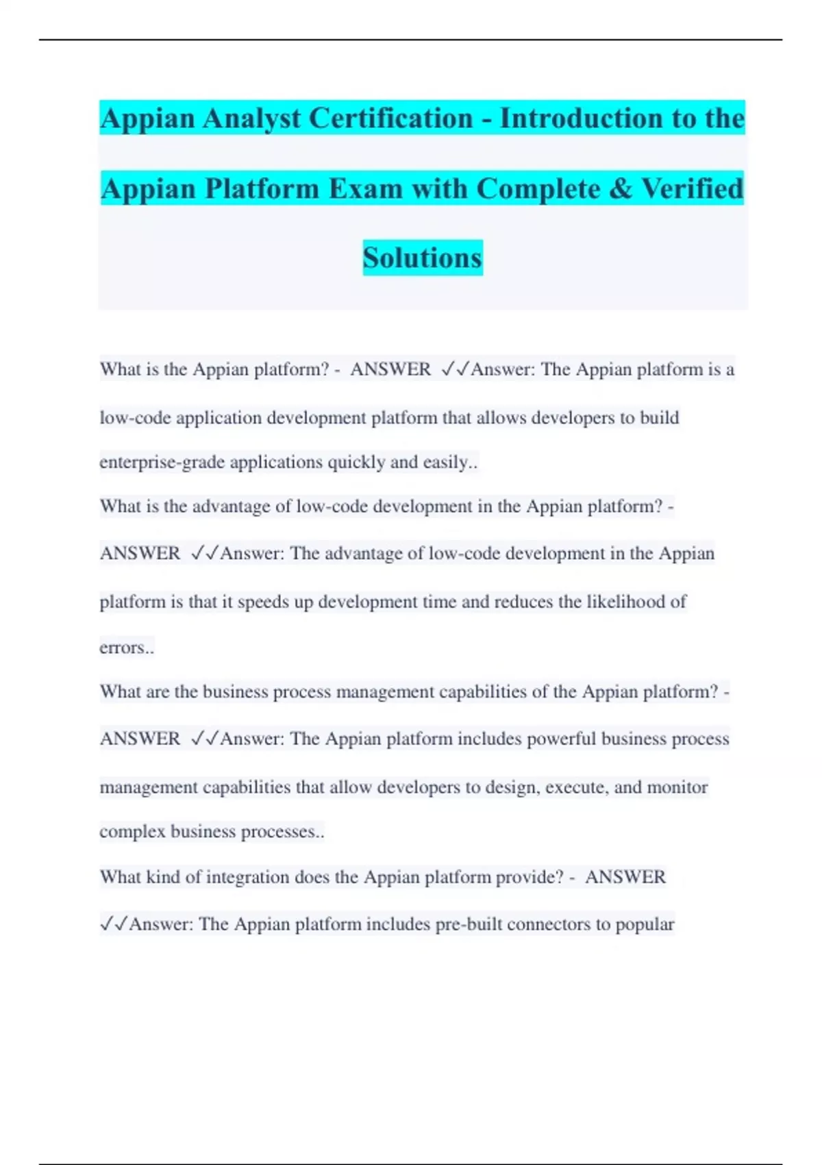 What is the Appian platform? - ANSWER Answer: The Appian platform is a low-code application development platform that allows developers to build enterprise-grade applications quickly and easily.. What is the advantage of low-code development in the Appian platform? - ANSWER Answer: The advantage of low-code development in the Appian platform is that it speeds up development time and reduces the likelihood of errors.. What are the business process management capabilities of the Appian platform? - ANSWER Answer: The Appian platform includes powerful business process management capabilities that allow developers to design, execute, and monitor complex business processes.. What kind of integration does the Appian platform provide? - ANSWER Answer: The Appian platform includes pre-built connectors to popular