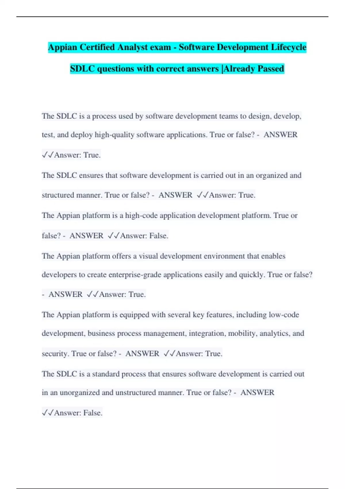 The SDLC is a process used by software development teams to design, develop, test, and deploy high-quality software applications. True or false? - ANSWER Answer: True. The SDLC ensures that software development is carried out in an organized and structured manner. True or false? - ANSWER Answer: True. The Appian platform is a high-code application development platform. True or false? - ANSWER Answer: False. The Appian platform offers a visual development environment that enables developers to create enterprise-grade applications easily and quickly. True or false? - ANSWER Answer: True. The Appian platform is equipped with several key features, including low-code development, business process management, integration, mobility, analytics, and security. True or false? - ANSWER Answer: True. The SDLC is a standard process that ensures software development is carried out in an unorganized and unstructured manner. True or false? - ANSWER Answer: False.