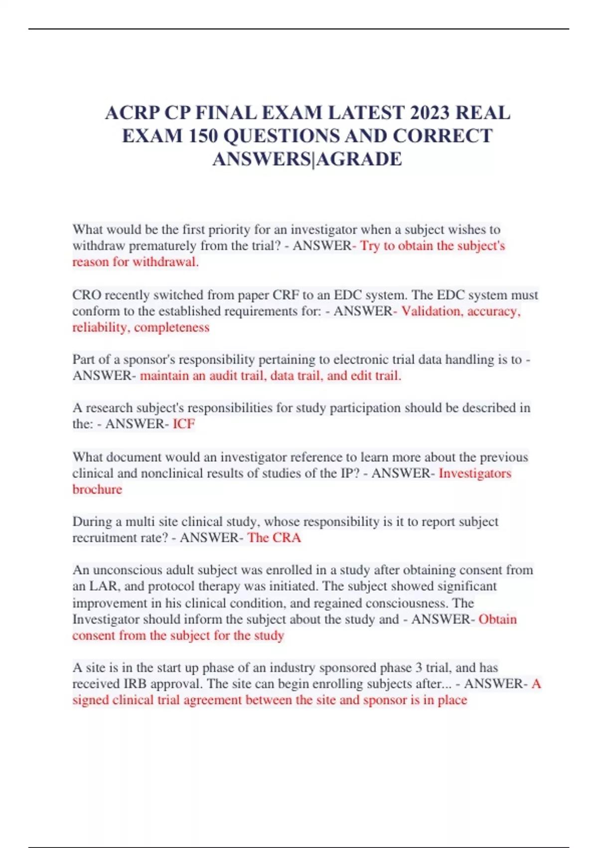 ACRP CP FINAL EXAM LATEST 2023 REAL EXAM 150 QUESTIONS AND CORRECT ANSWERS|AGRADE