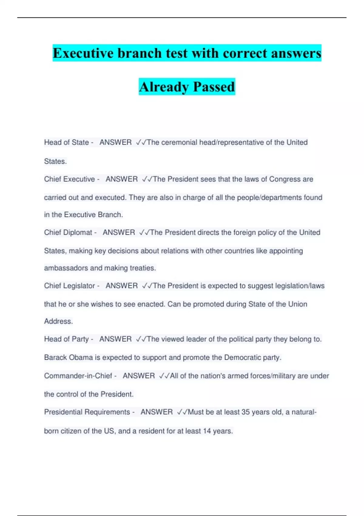 Head of State - ANSWER The ceremonial head/representative of the United States. Chief Executive - ANSWER The President sees that the laws of Congress are carried out and executed. They are also in charge of all the people/departments found in the Executive Branch. Chief Diplomat - ANSWER The President directs the foreign policy of the United States, making key decisions about relations with other countries like appointing ambassadors and making treaties. Chief Legislator - ANSWER The President is expected to suggest legislation/laws that he or she wishes to see enacted. Can be promoted during State of the Union Address. Head of Party - ANSWER The viewed leader of the political party they belong to. Barack Obama is expected to support and promote the Democratic party. Commander-in-Chief - ANSWER All of the nation's armed forces/military are under the control of the President.