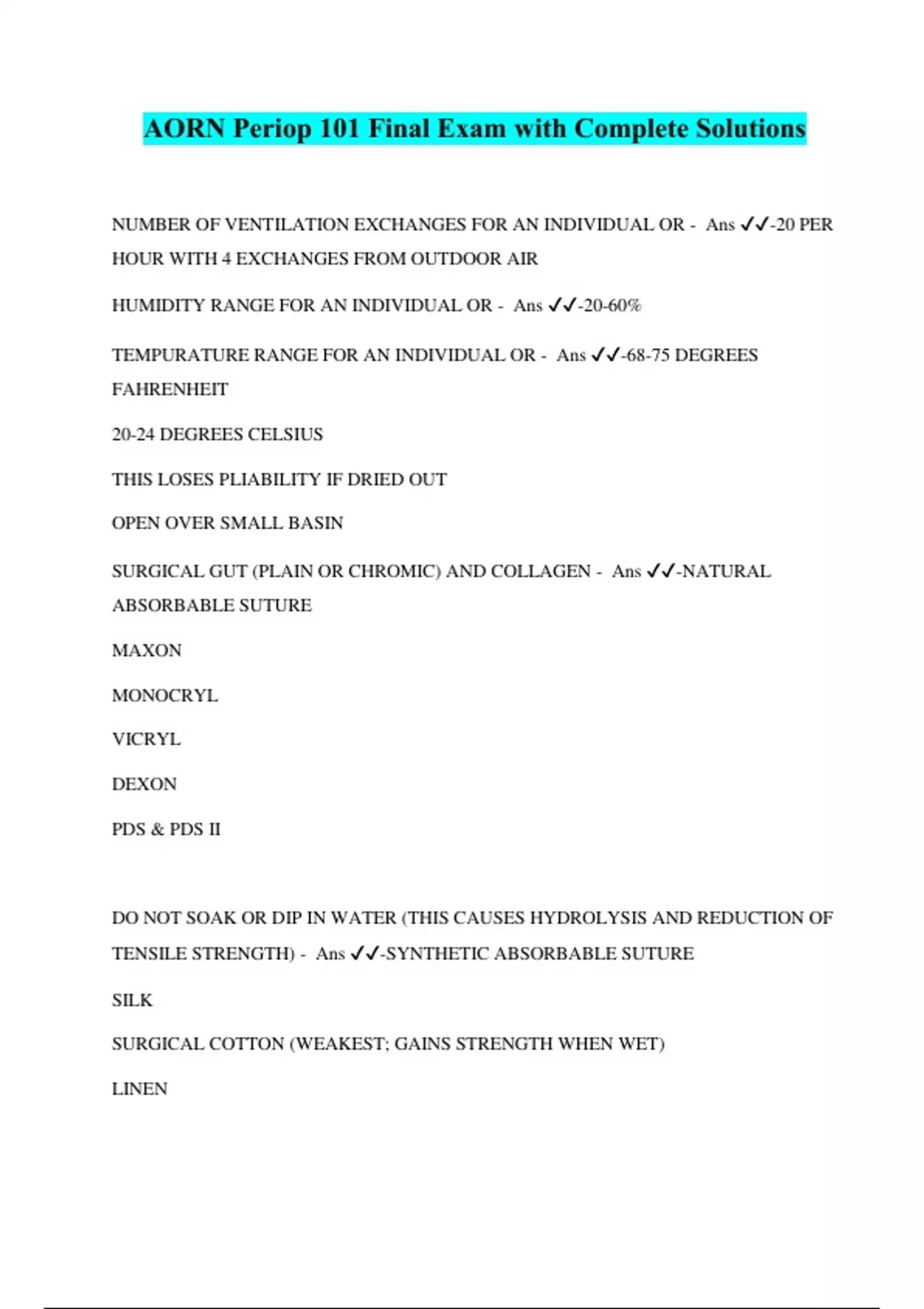 Periop 101 Final Exam Questions with Complete Solutions Major components of medical video imaging include: - Ans️️ -Fiber optic light cable, Camera Control Unit (CCU) Special considerations when using a endoscopic light source are: - Ans️️ -Place in "standby" mode, do not turn on until light cable is connected to the telescope, set according to manufacturer's parameters Special considerations when using insufflation (establishing a pneumoperitoneum) - Ans️️ -Always have a backup tank available, position at the level of the patients heart or higher to prevent gases from contaminating the device, make sure alarm is on and audible, maintain pressure under 12 mm/Hg Advantage of endoscopic surgery versus open surgery - Ans️️ -Smaller incisions Special considerations when using laparoscopic instruments - Ans️️ -Scrub should inspect more closely because of unapparent defects that may not be apparent with casual observation, focus on insulation because of risk for thermal burns if not intact Special considerations for patient undergoing MIS/Endoscopic Surgery - Ans️️ - Previous incisions (Hasson minilap) that may require additional sterile supplies, hx of DVT, consent for possibility of open procedure, voiding to empty bladder and prevent puncture during trocar placement/unnecessary catheterization Correct fluid management procedures in MIS - Ans️️ -Monitor overload of IV/irrigation fluids dispensed and returned during procedure (prevent hypervolemia/fluid overload) Mechanical Methods of Hemostasis - Ans️️ -Manual pressure (sponges), hemostatic clamps, sutures, staples, clips, ligatures, and/or pledgets What is a ligature? - Ans️️ -Also known as a tie, strand tied around a blood vessel to occlude bleeding; large vessels may require transfixion suture (crosscriss stitch) What is a pledget? - Ans️️ -Non-absorbable suture support used when possibility of sutures tearing through tissue