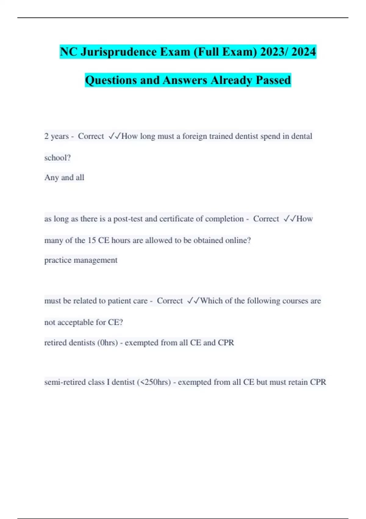 2 years - Correct How long must a foreign trained dentist spend in dental school? Any and all as long as there is a post-test and certificate of completion - Correct How many of the 15 CE hours are allowed to be obtained online? practice management must be related to patient care - Correct Which of the following courses are not acceptable for CE? retired dentists (0hrs) - exempted from all CE and CPR semi-retired class I dentist (<250hrs) - exempted from all CE but must retain CPR