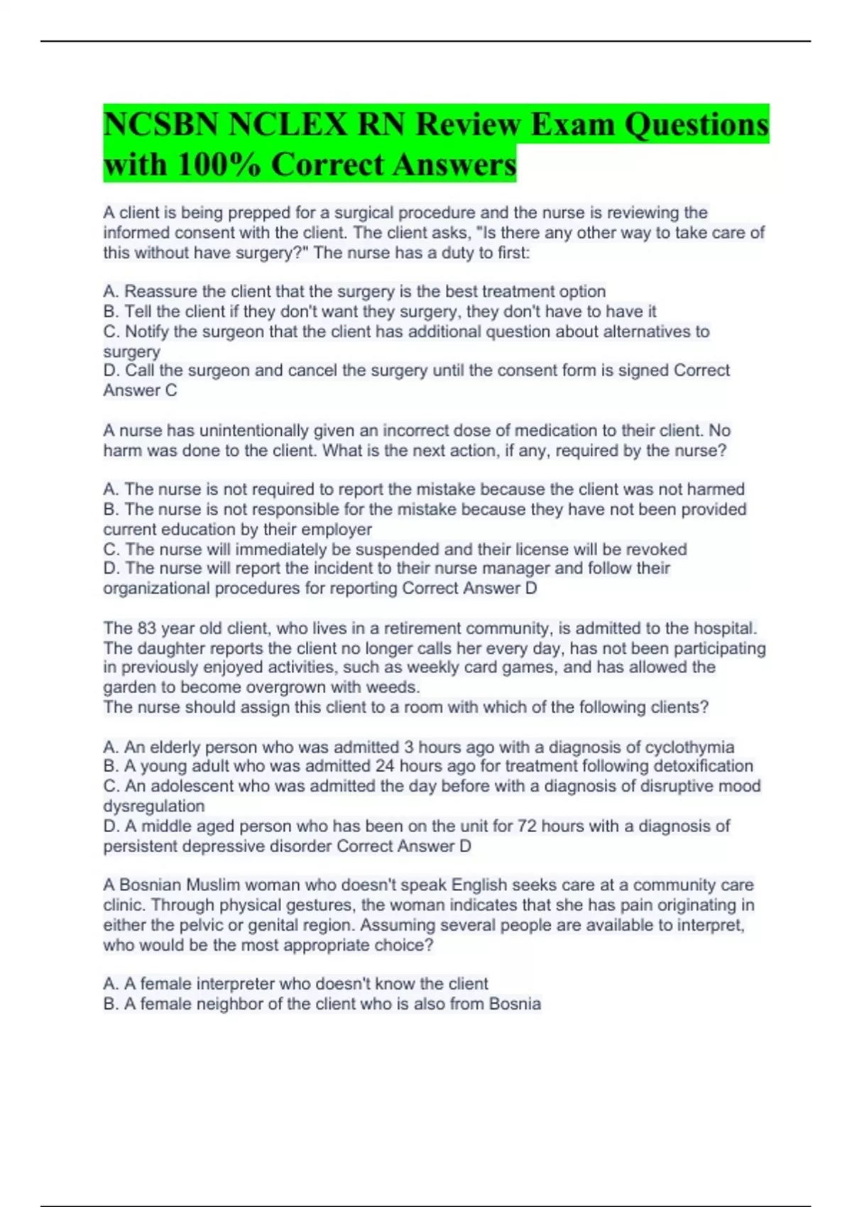 A client is being prepped for a surgical procedure and the nurse is reviewing the informed consent with the client. The client asks, "Is there any other way to take care of this without have surgery?" The nurse has a duty to first: A. Reassure the client that the surgery is the best treatment option B. Tell the client if they don't want they surgery, they don't have to have it C. Notify the surgeon that the client has additional question about alternatives to surgery D. Call the surgeon and cancel the surgery until the consent form is signed Correct Answer C A nurse has unintentionally given an incorrect dose of medication to their client. No harm was done to the client. What is the next action, if any, required by the nurse? A. The nurse is not required to report the mistake because the client was not harmed B. The nurse is not responsible for the mistake because they have not been provided current education by their employer C. The nurse will immediately be suspended and their license will be revoked D. The nurse will report the incident to their nurse manager and follow their organizational procedures for reporting Correct Answer D The 83 year old client, who lives in a retirement community, is admitted to the hospital. The daughter reports the client no longer calls her every day, has not been participating in previously enjoyed activities, such as weekly card games, and has allowed the garden to become overgrown with weeds. The nurse should assign this client to a room with which of the following clients? A. An elderly person who was admitted 3 hours ago with a diagnosis of cyclothymia B. A young adult who was admitted 24 hours ago for treatment following detoxification C. An adolescent who was admitted the day before with a diagnosis of disruptive mood dysregulation D. A middle aged person who has been on the unit for 72 hours with a diagnosis of persistent depressive disorder Correct Answer D A Bosnian Muslim woman who doesn't speak English seeks care at a community care clinic. Through physical gestures, the woman indicates that she has pain originating in either the pelvic or genital region. Assuming several people are available to interpret, who would be the most appropriate choice? A. A female interpreter who doesn't know the client B. A female neighbor of the client who is also from Bosnia